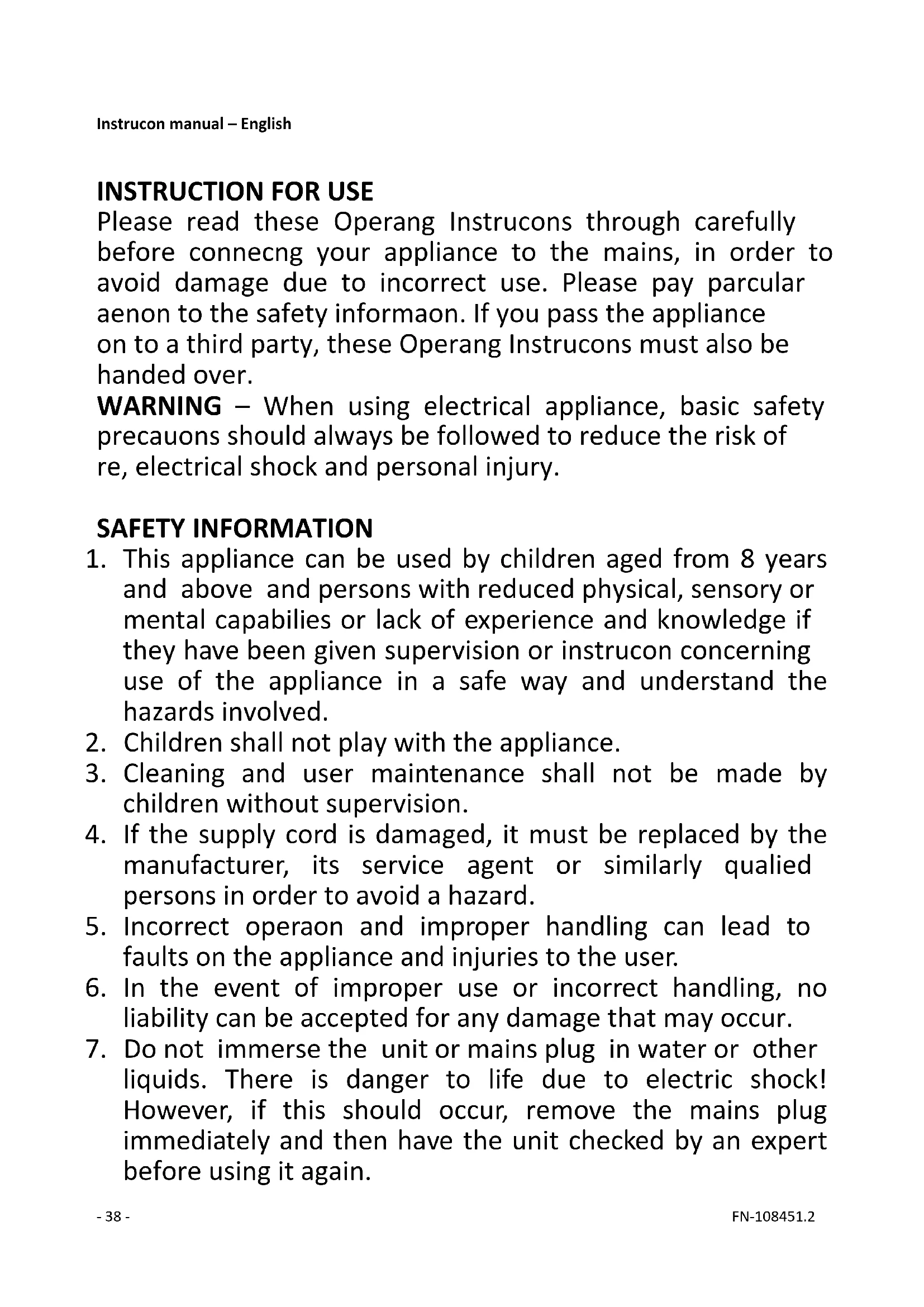 liquids. There is danger to life due to electric shock! However, if this should occur, remove the mains plug immediately and then have the unit checked by an expert before using it again.- 39 - FN-108451.2