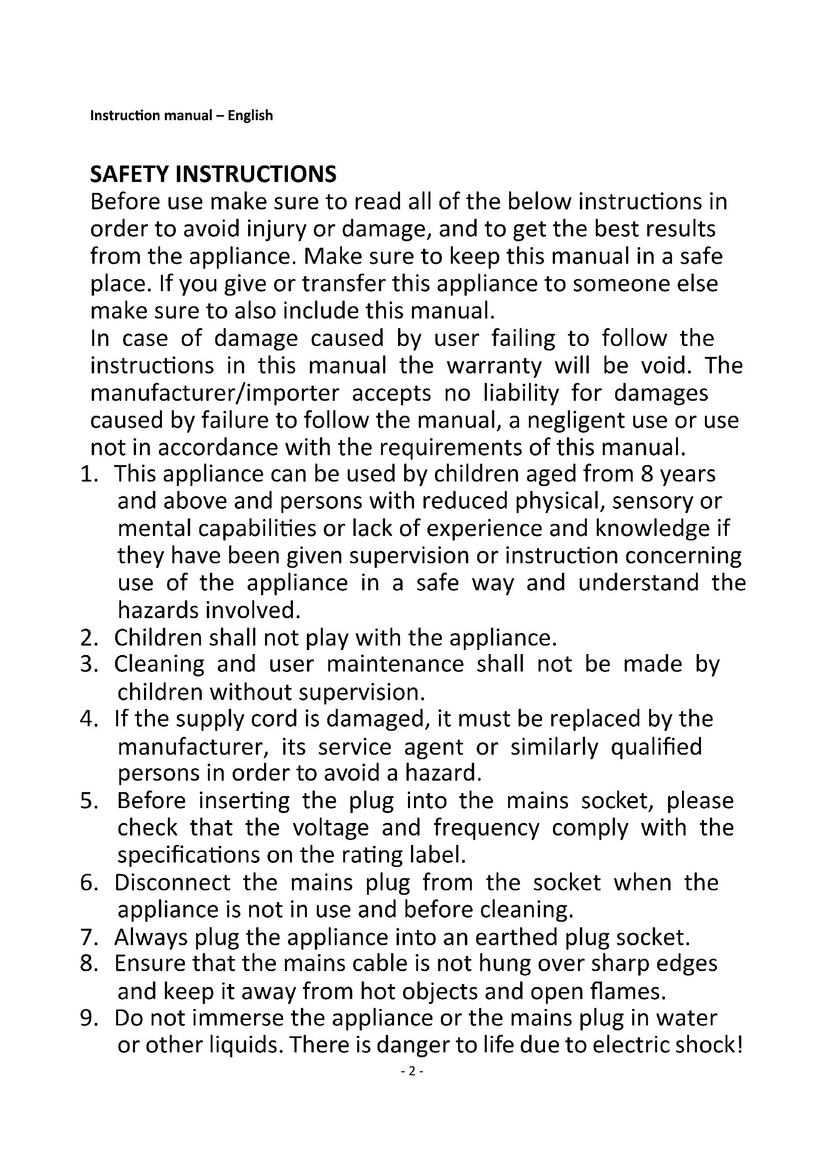 9. Do not immerse the appliance or the mains plug in water