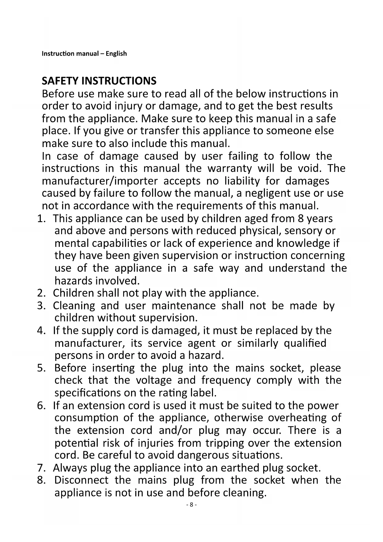 1. This appliance can be used by children aged from 8 years