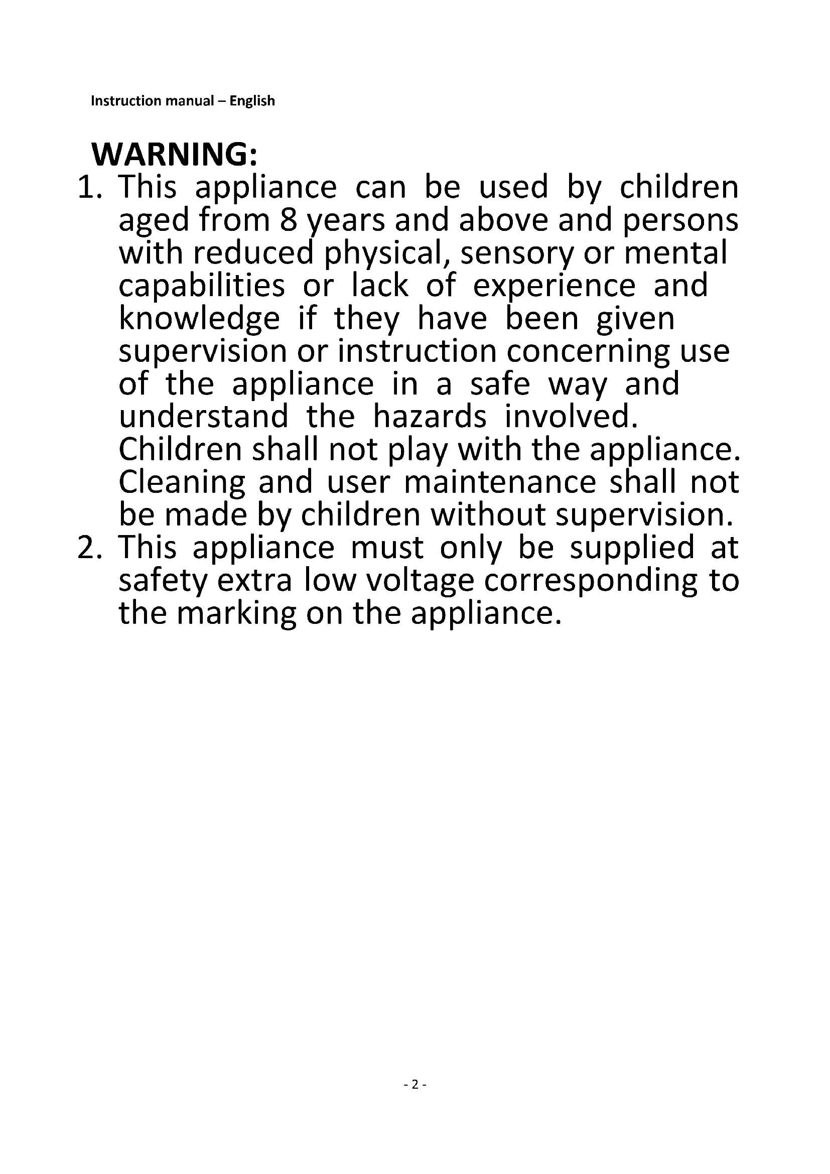 safety extra low voltage corresponding to the marking on the appliance.- 3 - SAFETY INSTRUCTIONS Before use make sure to read all of the below instructions in order to avoid injury or damage, and to get the best results from the appliance. Make sure to keep this manual in a safe place. If you give or transfer this appliance to someone else make sure to also include this manual. In case of damage caused by user failing to follow the instructions in this manual the warranty will be void. The manufacturer/importer accepts no liability for damages caused by failure to follow the manual, a negligent use or use not in accordance with the requirements of this manual.