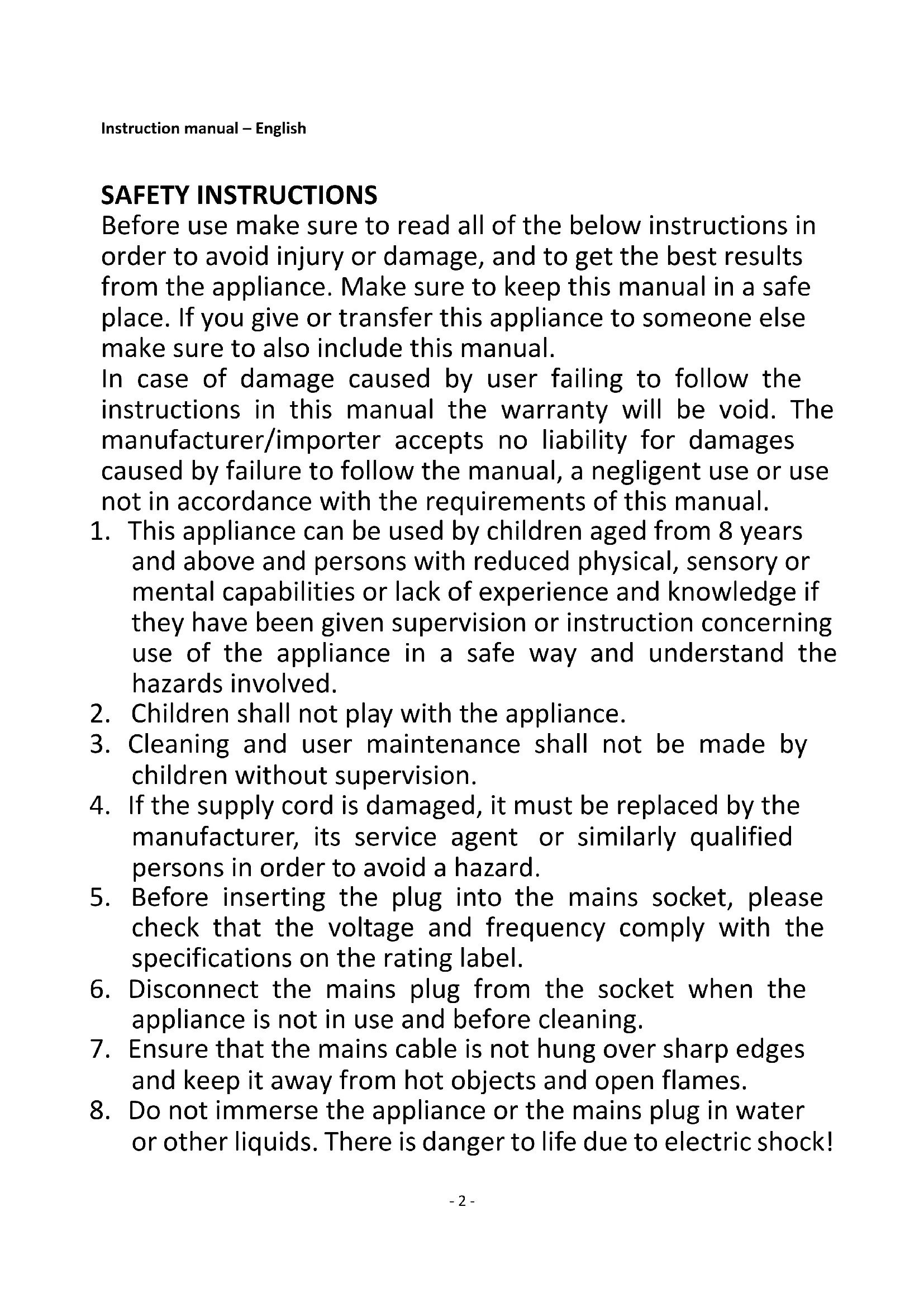 Before delivery our devices are subjected to rigorous quality control. If, despite all care, damage has occurred during production or transportation, please return the device to your dealer. In addition to statutory legal rights, the purchaser has an option to claim under the terms of the following guarantee: For the purchased device we provide 2 years guarantee, commencing from the day of sale. If you have a defective product, you can directly go back to the point of purchase. Defects which arise due to improper handling of the device and malfunctions due to interventions and repairs by third parties or the fitting of non-original parts are not covered by this guarantee. Always keep your receipt, without the receipt you can’t claim any form of warranty. Damage caused by not following the instruction manual, will lead to a void of warranty, if this results in consequential damages then we will not be liable. Neither can we hold responsible for material damage or personal injury caused by improper use if the instruction manual is not properly executed. Damage to accessories does not mean free replacement of the whole appliance. In such case please contact our service department. Broken glass or breakage of plastic parts is always subject to a charge.- 5 - Defects to consumables or parts subjected to wearing, as well as cleaning, maintenance or the replacement of said parts are not covered by the warranty and are to be paid.