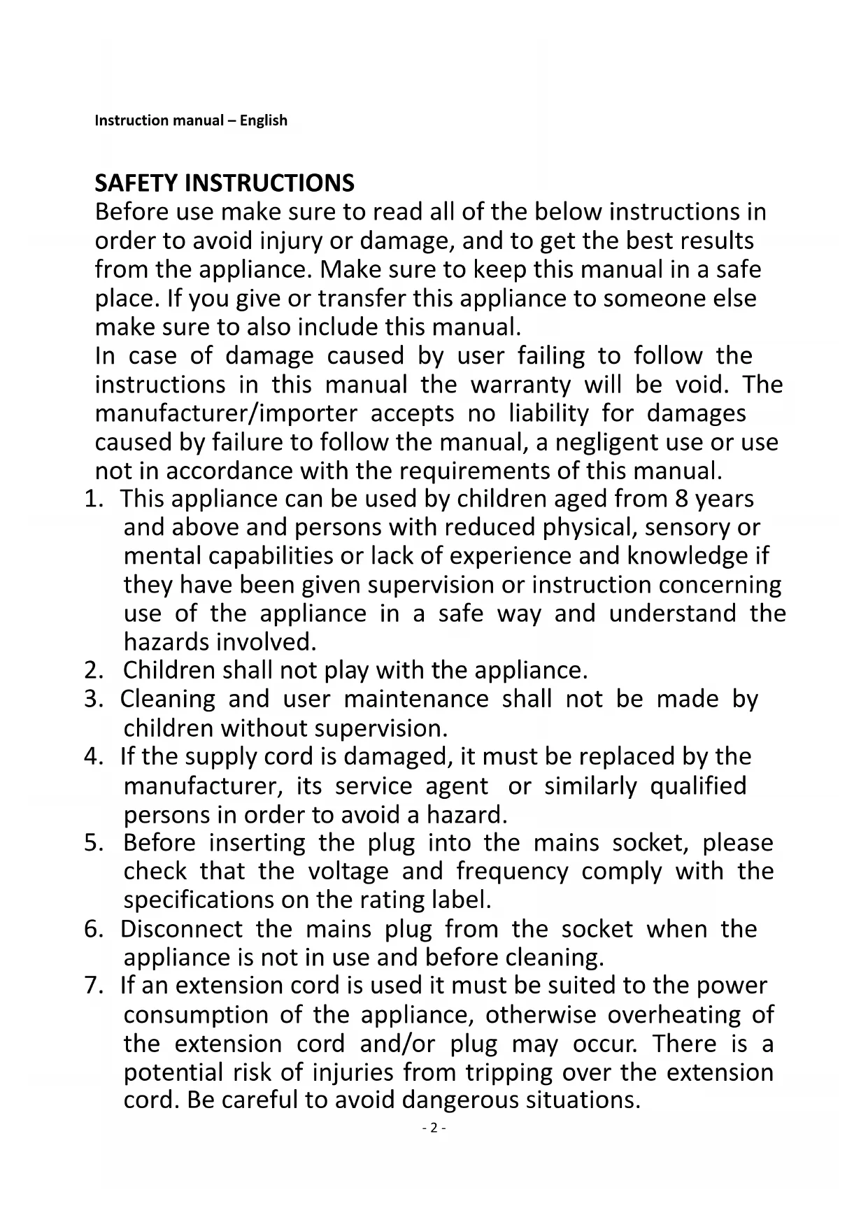 Instruction manual – English ...................................................................................... - 2 - Bedienungsanleitung – Deutsch ................................................................................. - 7 - Mode d‘emploi – Français ........................................................................................ - 13 - Manuale d'istruzioni – Italiano ................................................................................. - 19 -- 2 - Instruction manual – English SAFETY INSTRUCTIONS Before use make sure to read all of the below instructions in order to avoid injury or damage, and to get the best results from the appliance. Make sure to keep this manual in a safe place. If you give or transfer this appliance to someone else make sure to also include this manual. In case of damage caused by user failing to follow the instructions in this manual the warranty will be void. The manufacturer/importer accepts no liability for damages caused by failure to follow the manual, a negligent use or use not in accordance with the requirements of this manual.