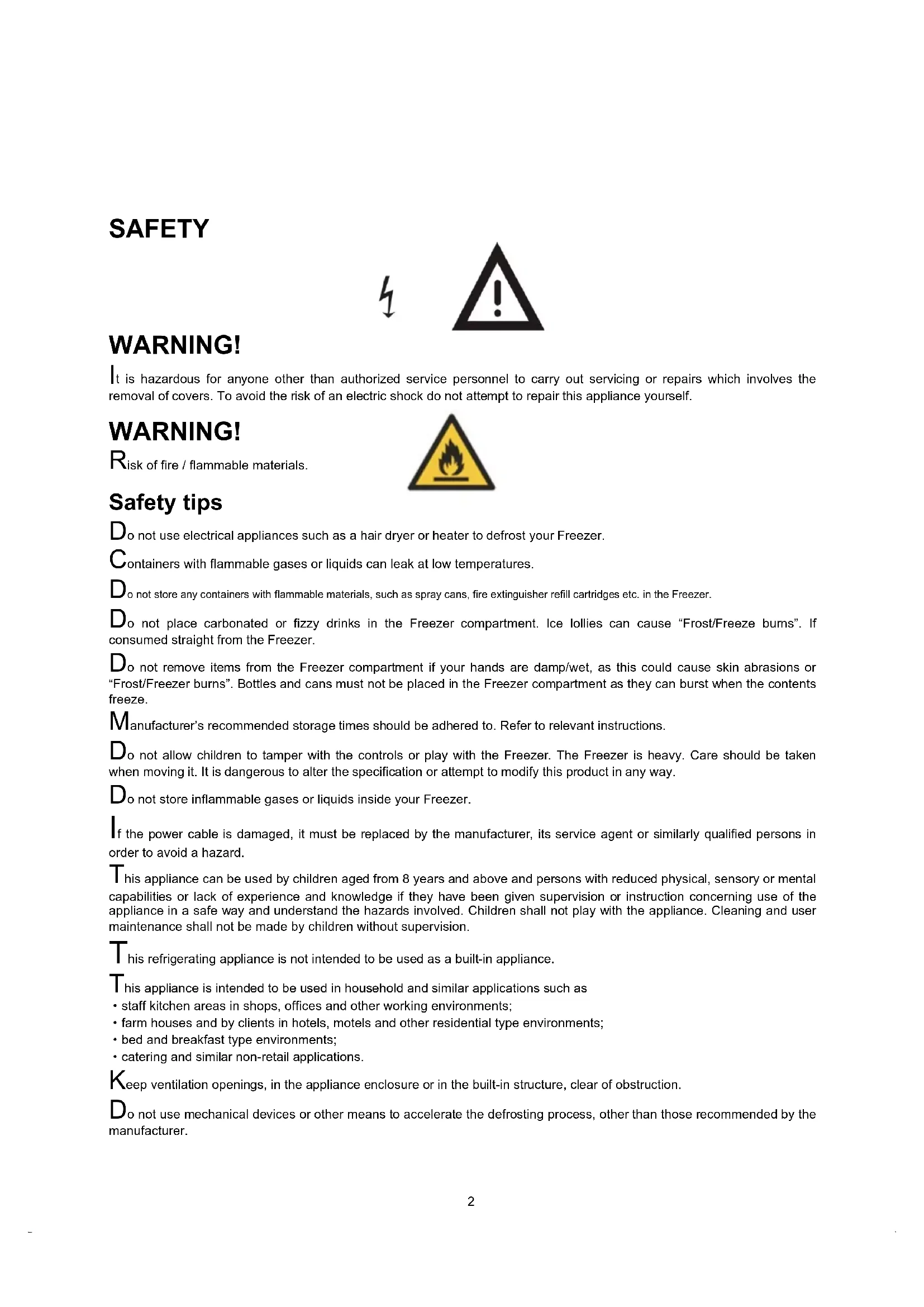 isk of fire / flammable materials. Safety tips Do not use electrical appliances such as a hair dryer or heater to defrost your Freezer. Containers with flammable gases or liquids can leak at low temperatures. Do not store any containers with flammable materials, such as spray cans, fire extinguisher refill cartridges etc. in the Freezer. Do not place carbonated or fizzy drinks in the Freezer compartment. Ice lollies can cause “Frost/Freeze burns”. If consumed straight from the Freezer. Do not remove items from the Freezer compartment if your hands are damp/wet, as this could cause skin abrasions or “Frost/Freezer burns”. Bottles and cans must not be placed in the Freezer compartment as they can burst when the contents freeze. Manufacturer’s recommended storage times should be adhered to. Refer to relevant instructions. Do not allow children to tamper with the controls or play with the Freezer. The Freezer is heavy. Care should be taken when moving it. It is dangerous to alter the specification or attempt to modify this product in any way. Do not store inflammable gases or liquids inside your Freezer. If the power cable is damaged, it must be replaced by the manufacturer, its service agent or similarly qualified persons in order to avoid a hazard. This appliance can be used by children aged from 8 years and above and persons with reduced physical, sensory or mental capabilities or lack of experience and knowledge if they have been given supervision or instruction concerning use of the appliance in a safe way and understand the hazards involved. Children shall not play with the appliance. Cleaning and user maintenance shall not be made by children without supervision. This refrigerating appliance is not intended to be used as a built-in appliance. This appliance is intended to be used in household and similar applications such as