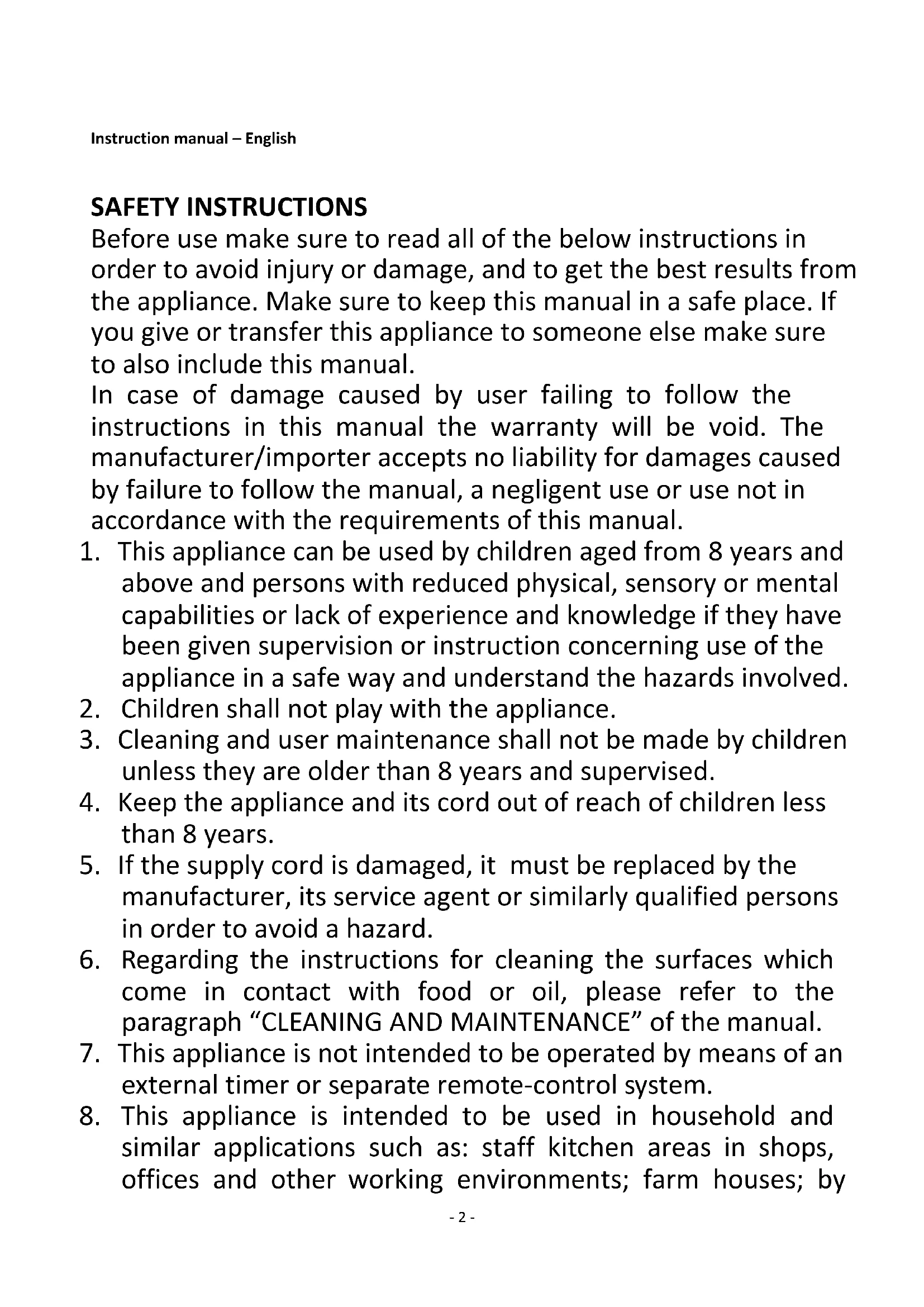 Before delivery our devices are subjected to rigorous quality control. If, despite all care, damage has occurred during production or transportation, please return the device to your dealer. In addition to statutory legal rights, the purchaser has an option to claim under the terms of the following guarantee: For the purchased device we provide 2 years guarantee, commencing from the day of sale. If you have a defective product, you can directly go back to the point of purchase. Defects which arise due to improper handling of the device and malfunctions due to interventions and repairs by third parties or the fitting of non-original parts are not covered by this guarantee. Always keep your receipt, without the receipt you can’t claim any form of warranty. Damage caused by not following the instruction manual, will lead to a void of warranty, if this results in consequential damages then we will not be liable. Neither can we hold responsible for material damage or personal injury caused by improper use if the instruction manual is not properly executed. Damage to accessories does not mean free replacement of the whole appliance. In such case please contact our service department. Broken glass or breakage of plastic parts is always subject to a charge. Defects to consumables or parts subjected to wearing, as well as cleaning, maintenance or the replacement of said parts are not covered by the warranty and are to be paid.