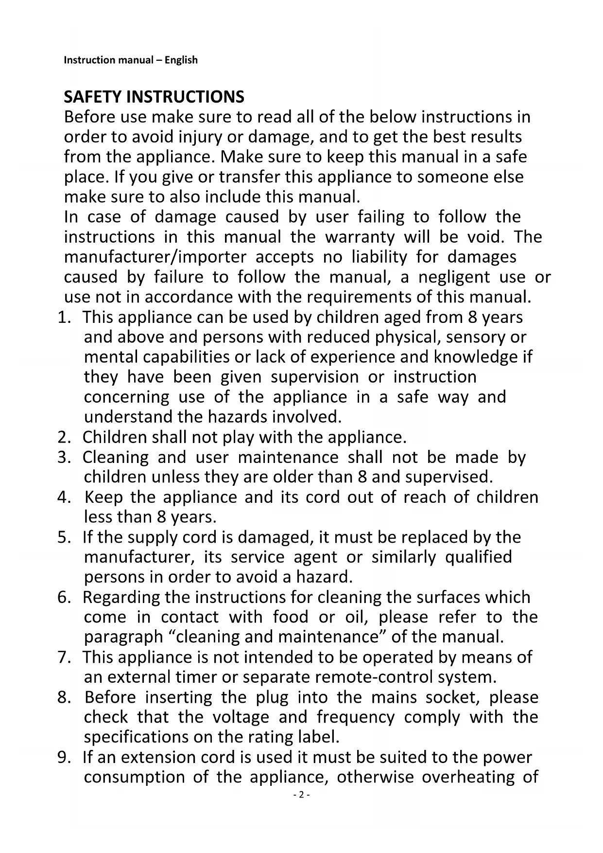 consumption of the appliance, otherwise overheating of- 3 - the extension cord and/or plug may occur. There is a potential risk of injuries from tripping over the extension cord. Be careful to avoid dangerous situations.