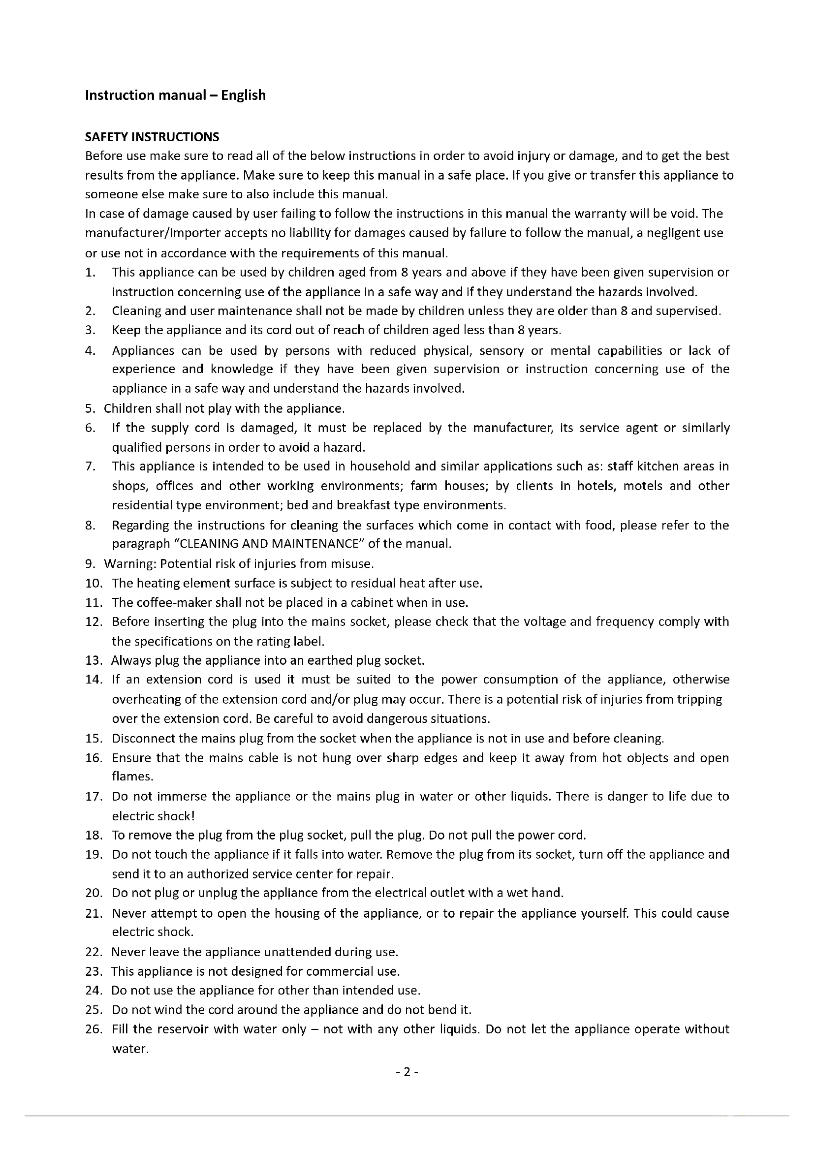 Before cleaning remove the mains plug and let the device cool down. Never immerse the device in water. Please use a slightly damp cloth to clean the surfaces. Clean all detachable parts after each use in hot, sudsy water. Use a damp cloth to gently wipe the tray. Never use abrasive cleaner to clean it. Keep the coffee maker in a dry place out of reach from children when cooled off and cleaned. Do not wrap the cord around the device. CAUTION: Always unplug the product from electrical outlet and allow the product to cool completely before cleaning it. Never immerse the unit or power cord into water or any other liquid for cleaning. TECHNICAL DATA Operating voltage: 230V ~ 50Hz Power: 900W