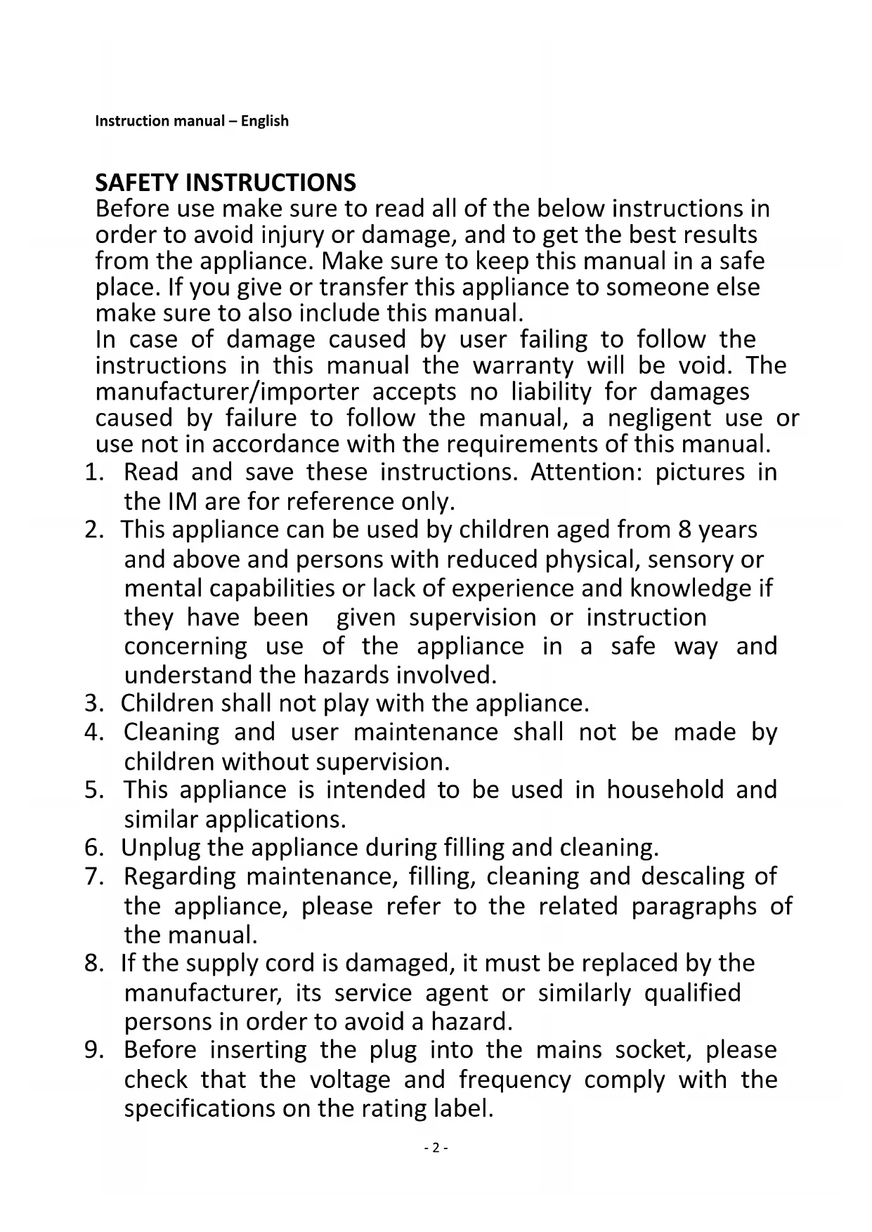 Before delivery our devices are subjected to rigorous quality control. If, despite all care, damage has occurred during production or transportation, please return the device to your dealer. In addition to statutory legal rights, the purchaser has an option to claim under the terms of the following guarantee: For the purchased device we provide 2 years guarantee, commencing from the day of sale. If you have a defective product, you can directly go back to the point of purchase. Defects which arise due to improper handling of the device and malfunctions due to interventions and repairs by third parties or the fitting of non-original parts are not covered by this guarantee. Always keep your receipt, without the receipt you can’t claim any form of warranty. Damage caused by not following the instruction manual, will lead to a void of warranty, if this results in consequential damages then we will not be liable. Neither can we hold responsible for material damage or personal injury caused by improper use if the- 11 - instruction manual is not properly executed. Damage to accessories does not mean free replacement of the whole appliance. In such case please contact our service department. Broken glass or breakage of plastic parts is always subject to a charge. Defects to consumables or parts subjected to wearing, as well as cleaning, maintenance or the replacement of said parts are not covered by the warranty and are to be paid.