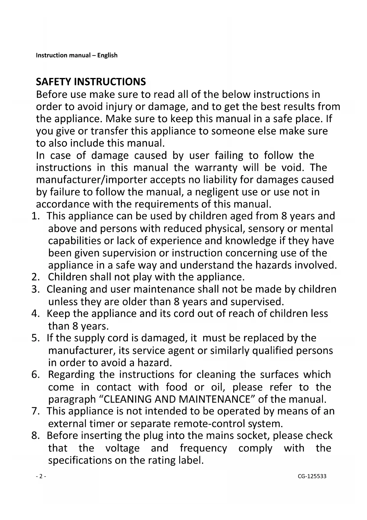Before delivery our devices are subjected to rigorous quality control. If, despite all care, damage has occurred during production or transportation, please return the device to your dealer. In addition to statutory legal rights, the purchaser has an option to claim under the terms of the following guarantee: For the purchased device we provide 2 years guarantee, commencing from the day of sale. If you have a defective product, you can directly go back to the point of purchase. Defects which arise due to improper handling of the device and malfunctions due to interventions and repairs by third parties or the fitting of non-original parts are not covered by this guarantee. Always keep your receipt, without the receipt you can’t claim any form of warranty. Damage caused by not following the instruction manual, will lead to a void of warranty, if this results in consequential damages then we will not be liable. Neither can we hold responsible for material damage or personal injury caused by improper use if the instruction manual is not properly executed. Damage to accessories does not mean free replacement of the whole appliance. In such case please contact our service department. Broken glass or breakage of plastic parts is always subject to a charge. Defects to consumables or parts subjected to wearing, as well as cleaning, maintenance or the replacement of said parts are not covered by the warranty and are to be paid.- 7 - CG-125533