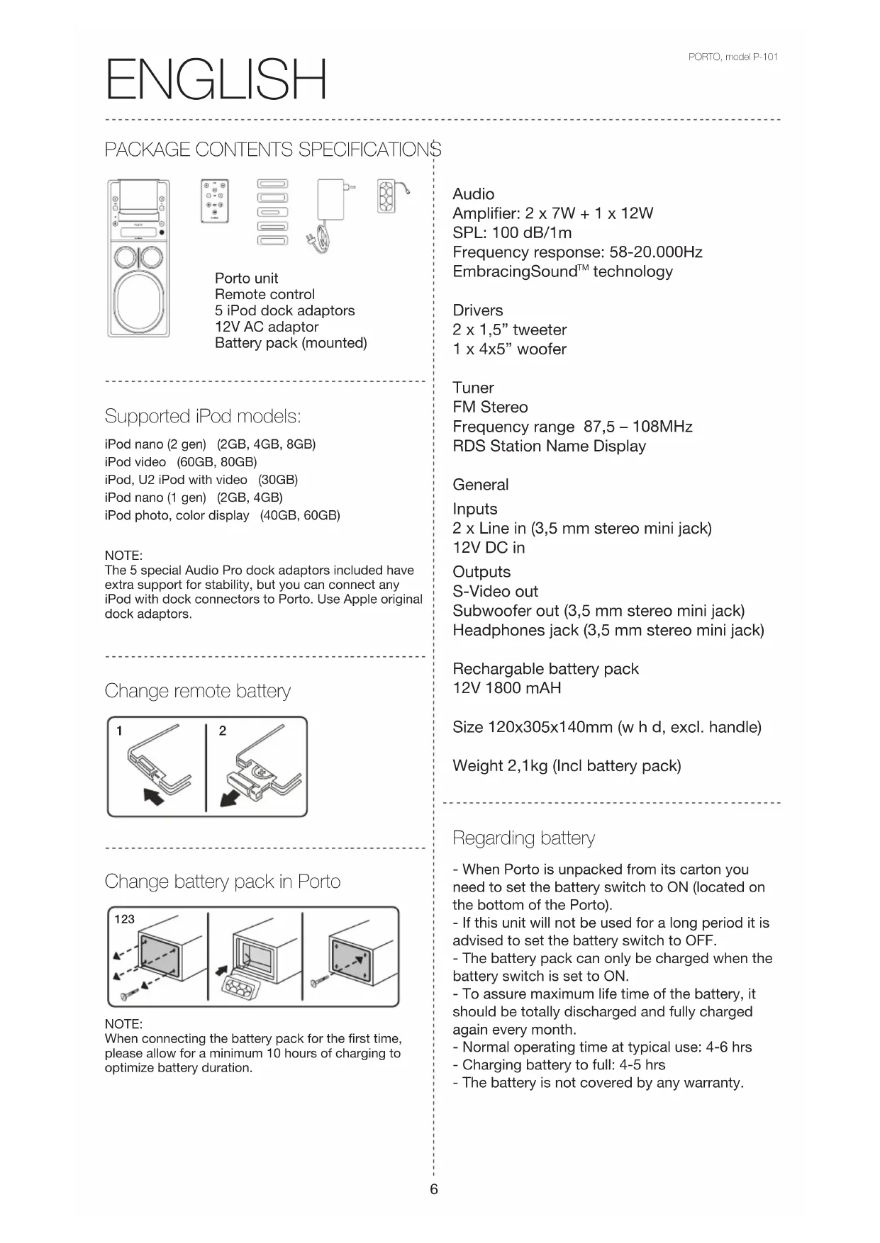 Change remote battery Change battery pack in Porto NOTE:When connecting the battery pack for the first time, please allow for a minimum 10 hours of charging to optimize battery duration. Supported iPod models: NOTE:The 5 special Audio Pro dock adaptors included have extra support for stability, but you can connect any iPod with dock connectors to Porto. Use Apple original dock adaptors. ENGLISH PORTO, model P-101iPod nano (2 gen) (2GB, 4GB, 8GB)iPod video (60GB, 80GB)iPod, U2 iPod with video (30GB)iPod nano (1 gen) (2GB, 4GB)iPod photo, color display (40GB, 60GB) Regarding battery Audio Amplifier: 2 x 7W + 1 x 12W SPL: 100 dB/1m Frequency response: 58-20.000Hz EmbracingSound