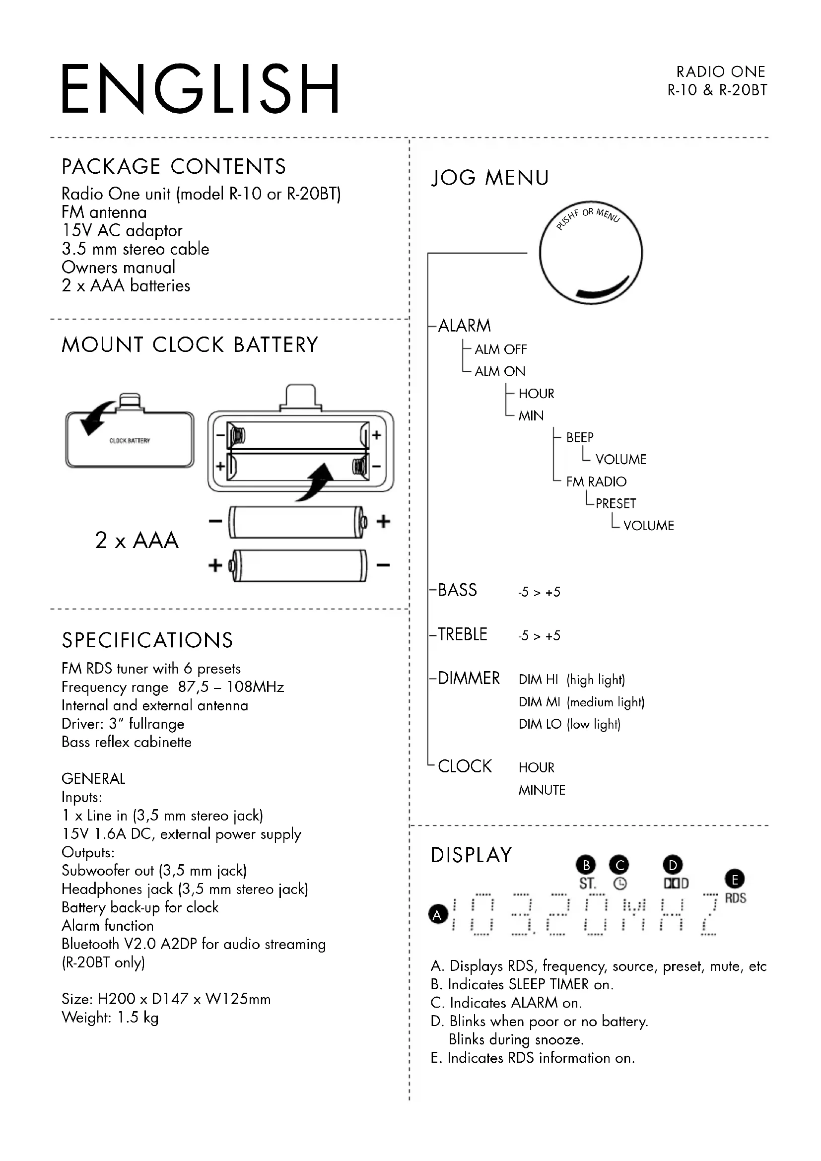 ENGLISH RADIO ONE R-10 & R-20BT SPECIFICATIONS FM RDS tuner with 6 presets Frequency range 87,5 – 108MHz Internal and external antenna Driver: 3” fullrange Bass reflex cabinette GENERAL Inputs: 1 x Line in (3,5 mm stereo jack) 15V 1.6A DC, external power supply Outputs: Subwoofer out (3,5 mm jack) Headphones jack (3,5 mm stereo jack) Battery back-up for clock Alarm function Bluetooth V2.0 A2DP for audio streaming (R-20BT only) Size: H200 x D147 x W125mm Weight: 1.5 kg A. Displays RDS, frequency, source, preset, mute, etc B. Indicates SLEEP TIMER on. C. Indicates ALARM on. D. Blinks when poor or no battery. Blinks during snooze. E. Indicates RDS information on. ALARM ALM OFF ALM ON HOUR MIN BEEP VOLUME FM RADIO PRESET VOLUME