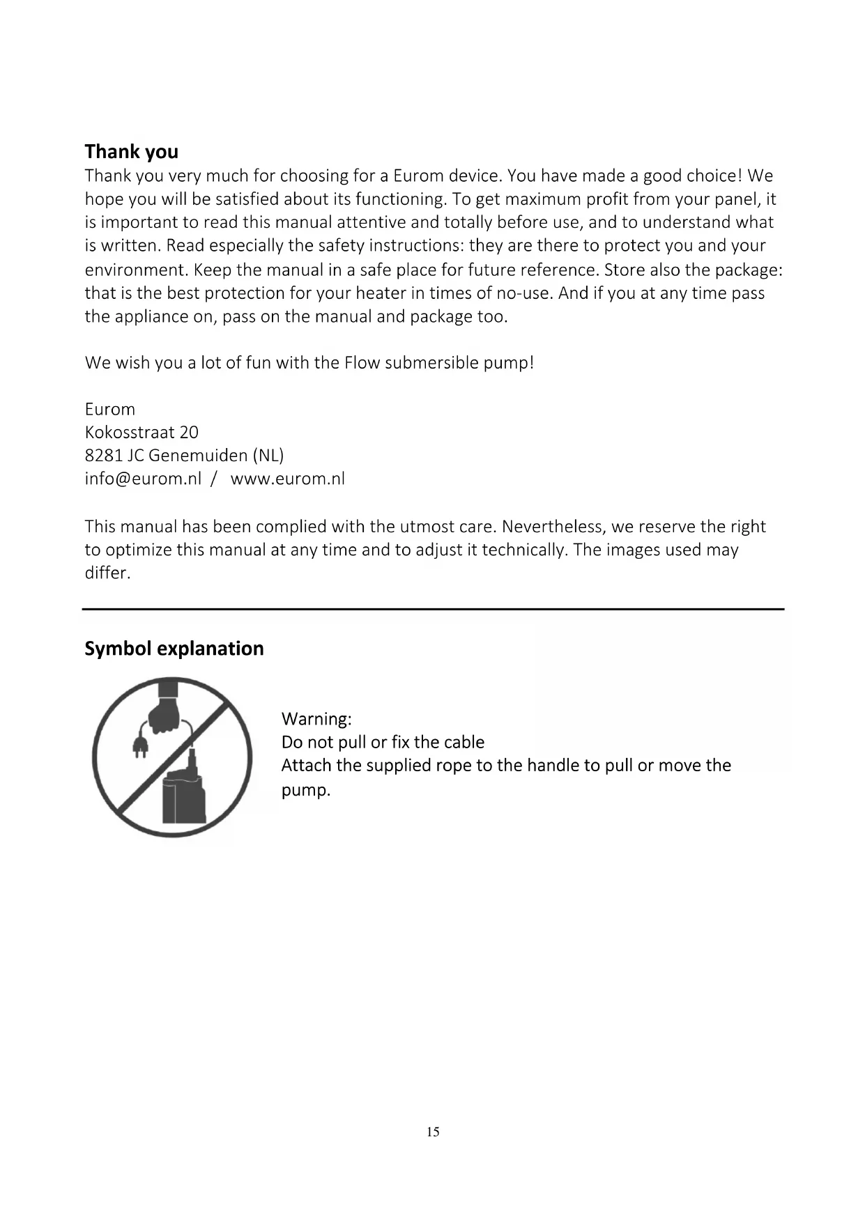Thank you Thank you very much for choosing for a Eurom device. You have made a good choice! We hope you will be satisfied about its functioning. To get maximum profit from your panel, it is important to read this manual attentive and totally before use, and to understand what is written. Read especially the safety instructions: they are there to protect you and your environment. Keep the manual in a safe place for future reference. Store also the package: that is the best protection for your heater in times of no-use. And if you at any time pass the appliance on, pass on the manual and package too. We wish you a lot of fun with the Flow submersible pump! Eurom Kokosstraat 20 8281 JC Genemuiden (NL) info@eurom.nl / www.eurom.nl This manual has been complied with the utmost care. Nevertheless, we reserve the right to optimize this manual at any time and to adjust it technically. The images used may differ.