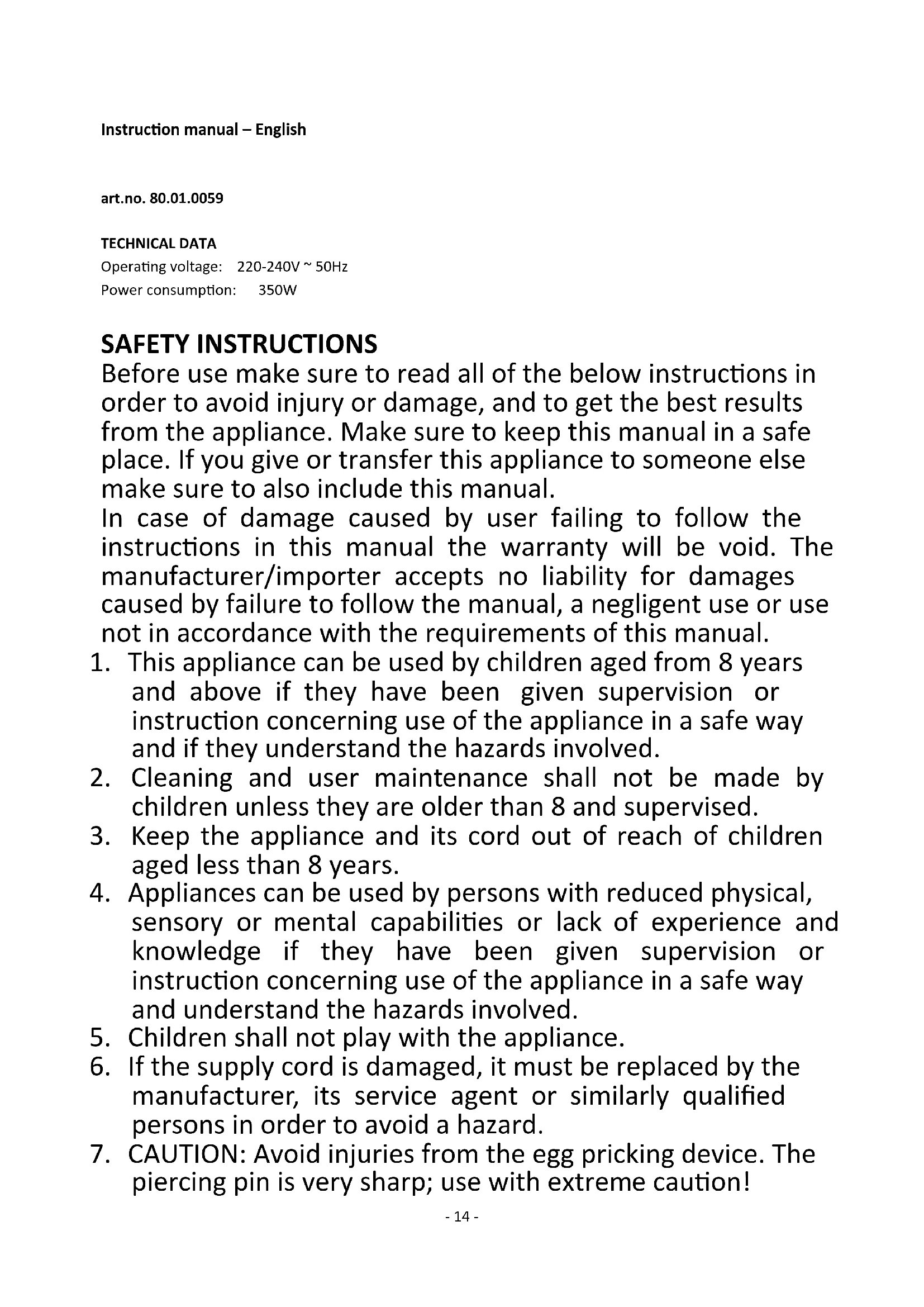 Fill the heating plate with the required amount of cold water, using the measuring cup. The graduations on the measuring cup correspond to the amount of water required to obtain 1 to 7 soft, medium or hard-boiled eggs. The graduations are given for medium-sized eggs. If the eggs are too soft, add a little more water than indicated on the cup, or less water if the eggs get too hard. Pierce the blunt end of the eggs with the egg piercer which is integrated in the egg tray. Put the eggs into the egg tray and close the lid. Plug in the egg boiler. A buzzer sounds when the eggs are ready. Disconnect the egg boiler from the wall socket. Take off the lid. Remove the egg tray from the heating plate and run the eggs under cold tap water. CLEANING INSTRUCTIONS Always unplug the appliance and allow cooling before cleaning. The egg tray and the cover can be washed normally. However, the heating plate which is fixed to the bottom of the appliance can only be cleaned with a moistened towel. Do not immerse the appliance in water! When excessive scales are deposited on the heating plate, normal household vinegar can be used to remove the scales. Dilute the vinegar with water (add 1 part vinegar to 10 parts of water). Pour the solution onto the heating plate. Allow soaking for about 30 minutes. Then pour away the liquid. Wipe the heating plate clean with a moistened towel. SAFETY MEASURES The appliance should not be used when: