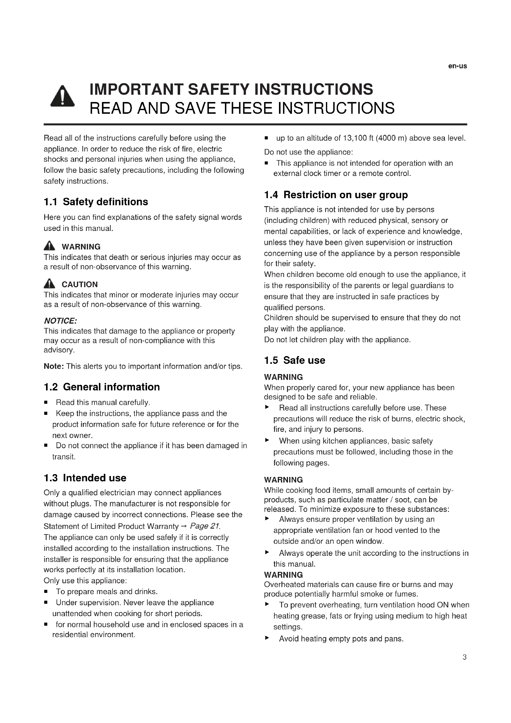 The appliance can only be used safely if it is correctly installed according to the installation instructions. The installer is responsible for ensuring that the appliance works perfectly at its installation location. Only use this appliance: ¡ To prepare meals and drinks. ¡ Under supervision. Never leave the appliance unattended when cooking for short periods. ¡ for normal household use and in enclosed spaces in a residential environment. ¡ up to an altitude of 13,100ft (4000m) above sea level. Do not use the appliance: ¡ This appliance is not intended for operation with an external clock timer or a remote control. 1.4 Restriction on user group This appliance is not intended for use by persons (including children) with reduced physical, sensory or mental capabilities, or lack of experience and knowledge, unless they have been given supervision or instruction concerning use of the appliance by a person responsible for their safety. When children become old enough to use the appliance, it is the responsibility of the parents or legal guardians to ensure that they are instructed in safe practices by qualified persons. Children should be supervised to ensure that they do not play with the appliance. Do not let children play with the appliance. 1.5 Safe use WARNING When properly cared for, your new appliance has been designed to be safe and reliable. ▶ Read all instructions carefully before use. These precautions will reduce the risk of burns, electric shock, fire, and injury to persons. ▶ When using kitchen appliances, basic safety precautions must be followed, including those in the following pages. WARNING While cooking food items, small amounts of certain by- products, such as particulate matter / soot, can be released. To minimize exposure to these substances: ▶ Always ensure proper ventilation by using an appropriate ventilation fan or hood vented to the outside and/or an open window. ▶ Always operate the unit according to the instructions in this manual. WARNING Overheated materials can cause fire or burns and may produce potentially harmful smoke or fumes. ▶ To prevent overheating, turn ventilation hood ON when heating grease, fats or frying using medium to high heat settings. ▶ Avoid heating empty pots and pans.