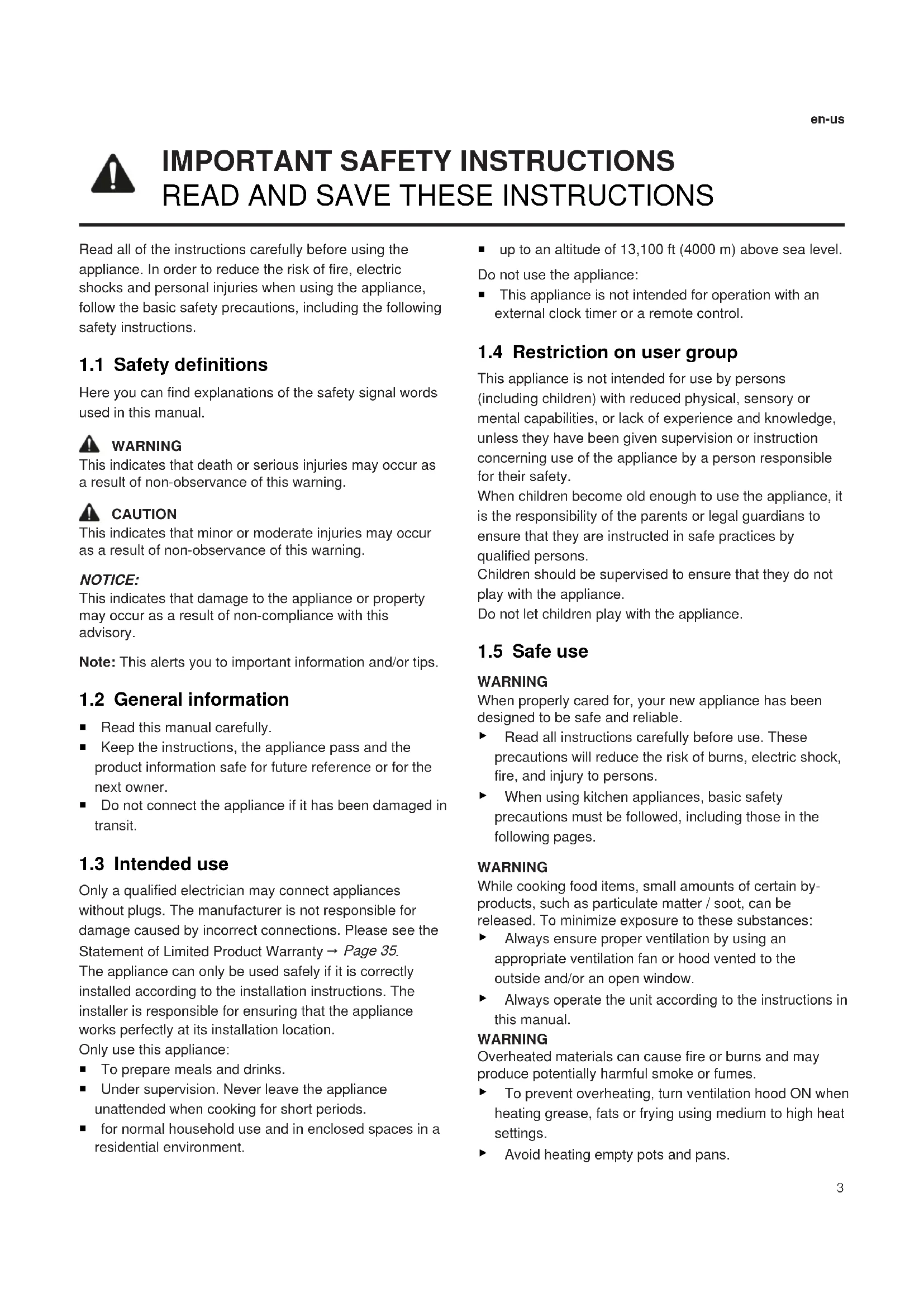 The appliance can only be used safely if it is correctly installed according to the installation instructions. The installer is responsible for ensuring that the appliance works perfectly at its installation location. Only use this appliance: ¡ To prepare meals and drinks. ¡ Under supervision. Never leave the appliance unattended when cooking for short periods. ¡ for normal household use and in enclosed spaces in a residential environment. ¡ up to an altitude of 13,100ft (4000m) above sea level. Do not use the appliance: ¡ This appliance is not intended for operation with an external clock timer or a remote control. 1.4 Restriction on user group This appliance is not intended for use by persons (including children) with reduced physical, sensory or mental capabilities, or lack of experience and knowledge, unless they have been given supervision or instruction concerning use of the appliance by a person responsible for their safety. When children become old enough to use the appliance, it is the responsibility of the parents or legal guardians to ensure that they are instructed in safe practices by qualified persons. Children should be supervised to ensure that they do not play with the appliance. Do not let children play with the appliance. 1.5 Safe use WARNING When properly cared for, your new appliance has been designed to be safe and reliable. ▶ Read all instructions carefully before use. These precautions will reduce the risk of burns, electric shock, fire, and injury to persons. ▶ When using kitchen appliances, basic safety precautions must be followed, including those in the following pages. WARNING While cooking food items, small amounts of certain by- products, such as particulate matter / soot, can be released. To minimize exposure to these substances: ▶ Always ensure proper ventilation by using an appropriate ventilation fan or hood vented to the outside and/or an open window. ▶ Always operate the unit according to the instructions in this manual. WARNING Overheated materials can cause fire or burns and may produce potentially harmful smoke or fumes. ▶ To prevent overheating, turn ventilation hood ON when heating grease, fats or frying using medium to high heat settings. ▶ Avoid heating empty pots and pans.