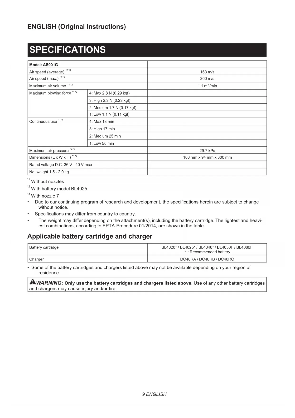 - Theweightmaydierdependingontheattachment(s),includingthebatterycartridge.Thelightestandheavi- est combinations, according to EPTA-Procedure 01/2014, are shown in the table. Applicable battery cartridge and charger Battery cartridge BL4020* / BL4025* / BL4040* / BL4050F / BL4080F