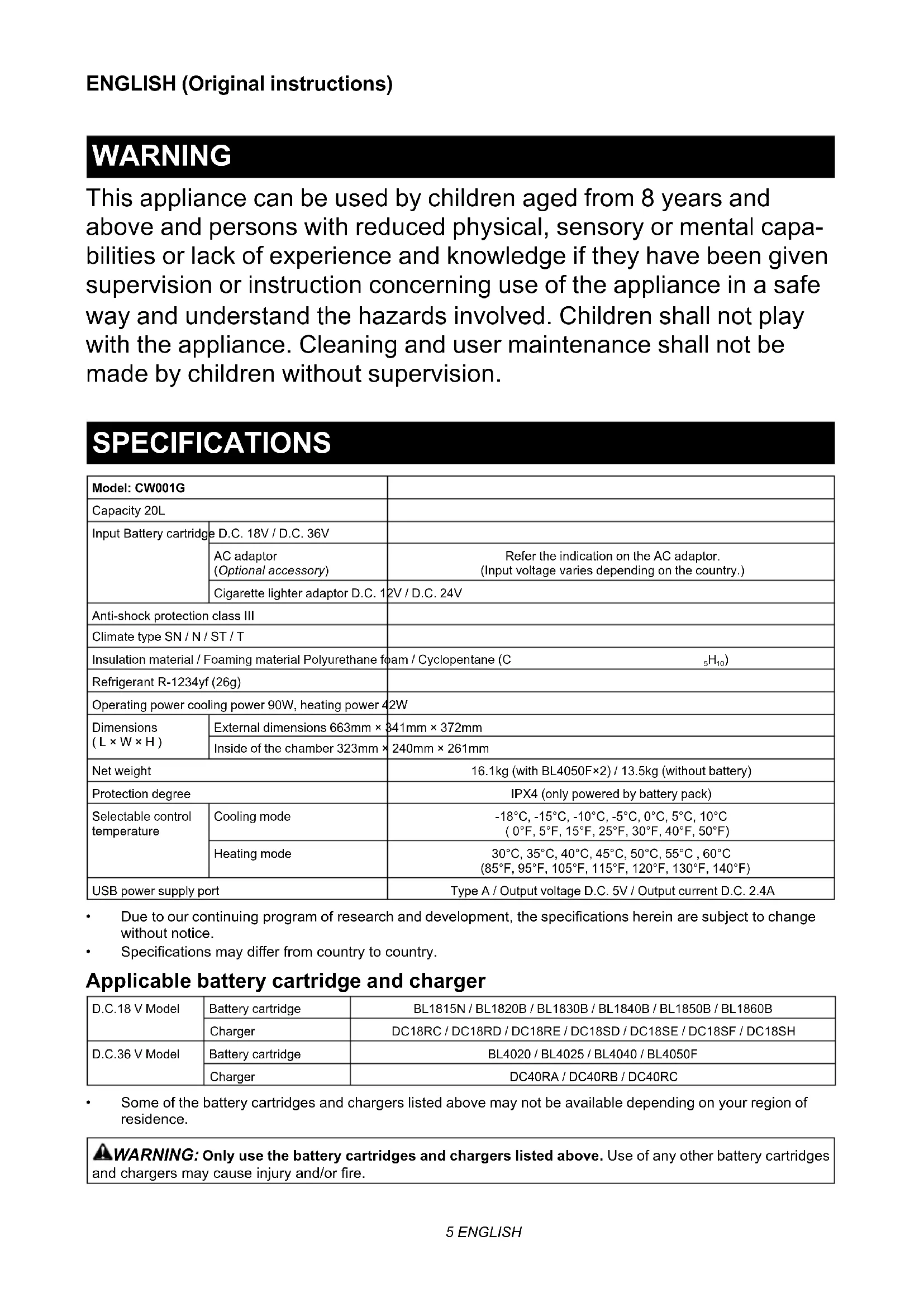 Fig.74 Fig.8 Fig.9 Fig.105 ENGLISH ENGLISH (Original instructions) WARNING This appliance can be used by children aged from 8 years and above and persons with reduced physical, sensory or mental capa- bilities or lack of experience and knowledge if they have been given supervision or instruction concerning use of the appliance in a safe way and understand the hazards involved. Children shall not play with the appliance. Cleaning and user maintenance shall not be made by children without supervision. SPECIFICATIONS Model: CW001GCapacity 20LInput Battery cartridge D.C. 18V / D.C. 36VAC adaptor (Optional accessory)Refer the indication on the AC adaptor.(Input voltage varies depending on the country.)Cigarette lighter adaptor D.C. 12V / D.C. 24VAnti-shock protection class IIIClimate type SN / N / ST / TInsulation material / Foaming material Polyurethane foam / Cyclopentane (C