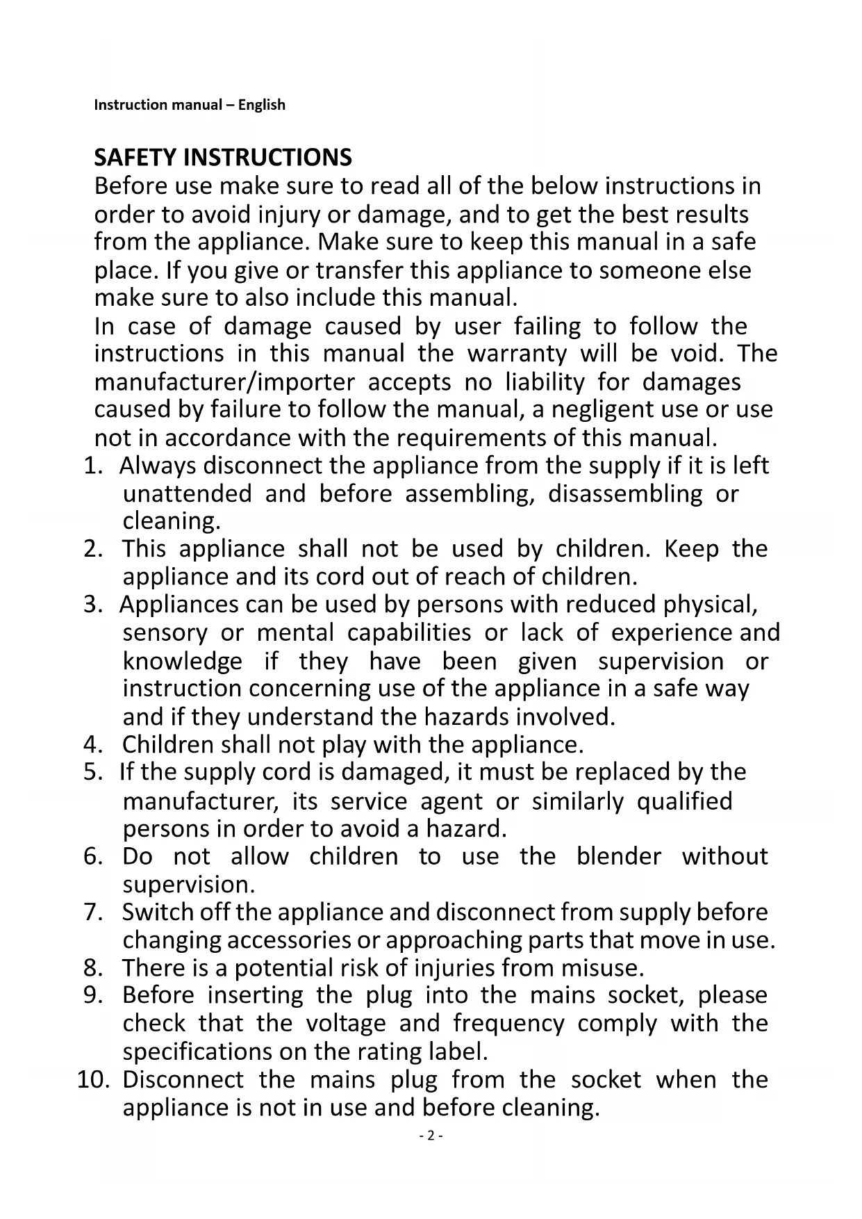 2. Disconnect the appliance from power supply before changing accessories or approaching parts that move