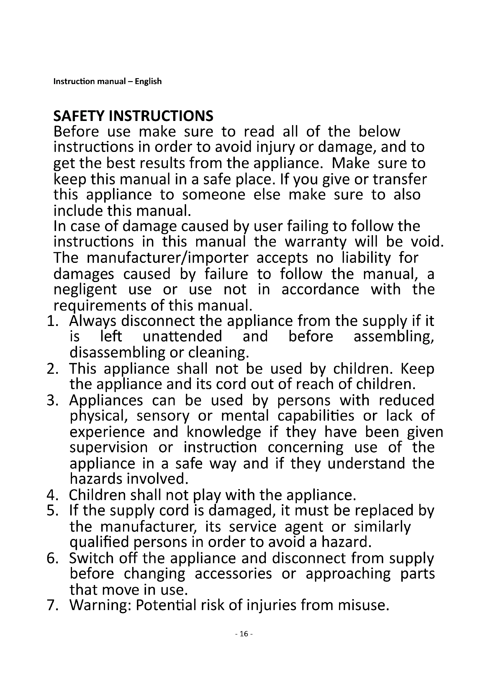 16. Never attempt to open the housing of the appliance,