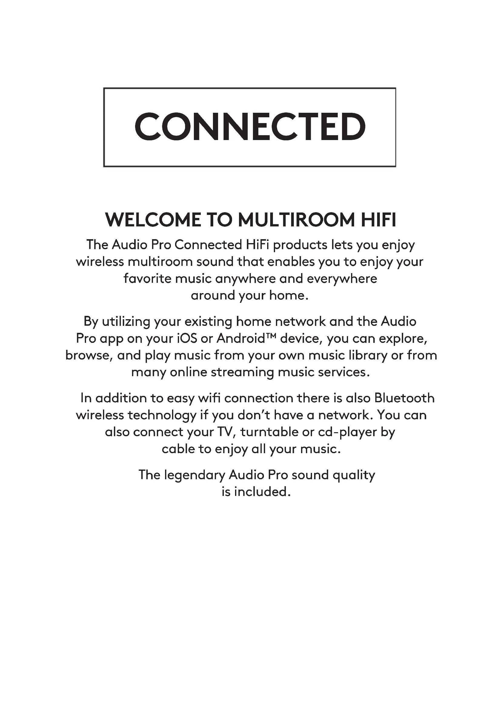 The Audio Pro Connected HiFi products lets you enjoy wireless multiroom sound that enables you to enjoy your favorite music anywhere and everywhere around your home. By utilizing your existing home network and the Audio Pro app on your iOS or Android™ device, you can explore, browse, and play music from your own music library or from many online streaming music services. In addition to easy wifi connection there is also Bluetooth wireless technology if you don’t have a network. You can also connect your TV, turntable or cd-player by cable to enjoy all your music. The legendary Audio Pro sound quality is included.Your new speaker has Spotify Connect built in. You need a Spotify Premium subscription to take advantage of Spotify Connect. Spotify Connect lets you control the music playing on your device, using the Spotify app on your mobile, tablet or PC. Listening is seamless. You can take calls, play games, even switch your phone o – all without interrupting the music. Learn more at spotify.com/connect The Spotify software is subject to third party licenses found here: www.spotify. com/connect/third-party-licenses Google, the Google logo, Google Apps, Android, Android Market, Google Places, Google Maps, YouTube, Google Navigation, Google Calendar, Gmail and Google Search are trademarks of Google Inc. Android™ is a trademark of Google, Inc. The Android robot is created and shared by Google and used according to the Creative Com- mons 3.0 Attribution License. © Apple, the Apple logo, Airplay, iPad, iPhone, and iPod touch are trademarks of Apple Inc., registered in the U.S. and other countries. App Store is a service mark of Apple Inc. The Bluetooth® word mark and logos are registered trademarks owned by Bluetooth SIG, Inc. and any use of such marks by AUDIO PRO AB, is under license. Other trademarks and trade names are those of thier respective owners. The Wi-Fi CERTIFIED Logo is a certification mark of the Wi-Fi Alliance.© AUDIO PRO AB, SWEDEN. ALL RIGHTS RESERVED. TRADEMARKS ARE THE PROPERTY OF AUDIO PRO AB, SWEDEN. Audio Pro, Box 22272, Garnisonsgatan 52, SE-250 24 Helsingborg, Sweden ©1978-2018 Audio Pro AB Sweden. Audio Pro