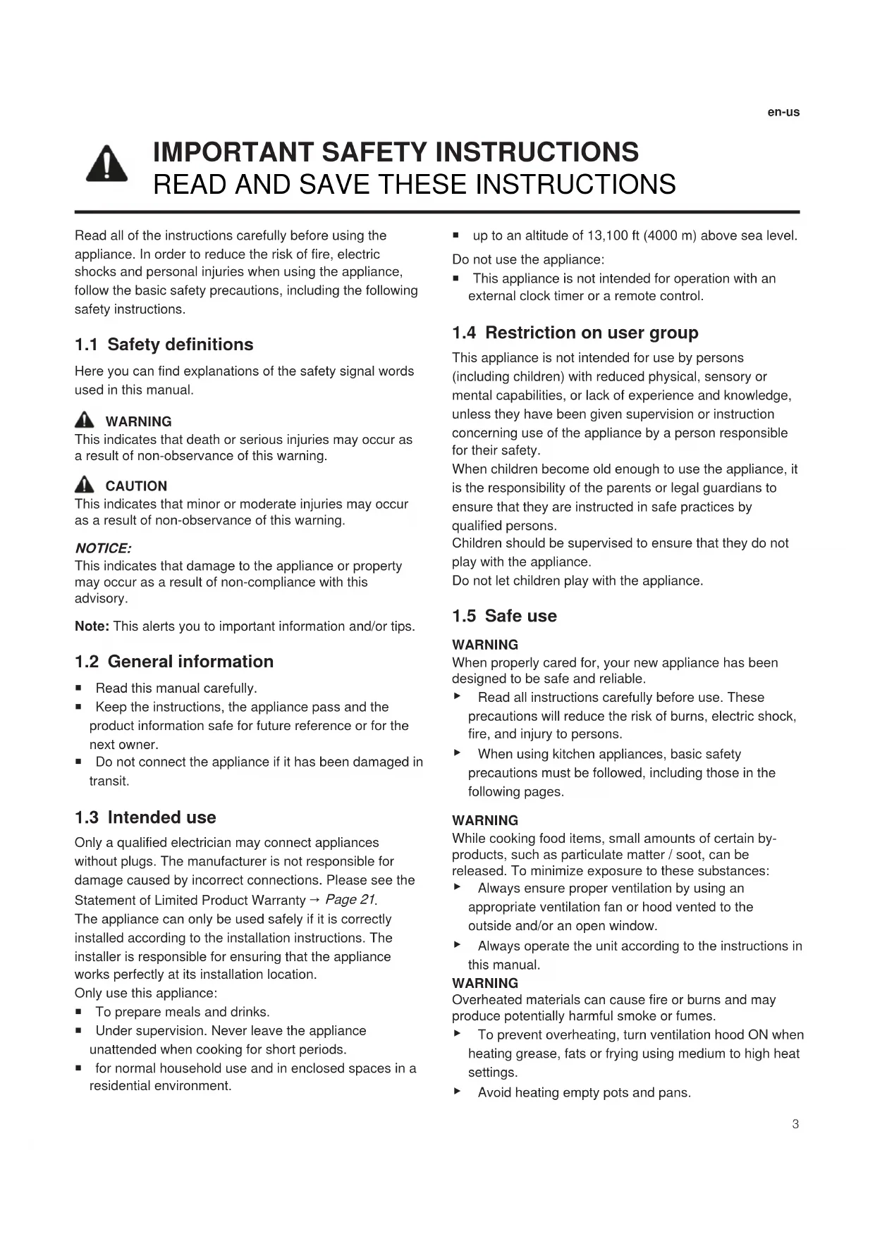 The appliance can only be used safely if it is correctly installed according to the installation instructions. The installer is responsible for ensuring that the appliance works perfectly at its installation location. Only use this appliance: ¡ To prepare meals and drinks. ¡ Under supervision. Never leave the appliance unattended when cooking for short periods. ¡ for normal household use and in enclosed spaces in a residential environment. ¡ up to an altitude of 13,100ft (4000m) above sea level. Do not use the appliance: ¡ This appliance is not intended for operation with an external clock timer or a remote control. 1.4 Restriction on user group This appliance is not intended for use by persons (including children) with reduced physical, sensory or mental capabilities, or lack of experience and knowledge, unless they have been given supervision or instruction concerning use of the appliance by a person responsible for their safety. When children become old enough to use the appliance, it is the responsibility of the parents or legal guardians to ensure that they are instructed in safe practices by qualified persons. Children should be supervised to ensure that they do not play with the appliance. Do not let children play with the appliance. 1.5 Safe use WARNING When properly cared for, your new appliance has been designed to be safe and reliable. ▶ Read all instructions carefully before use. These precautions will reduce the risk of burns, electric shock, fire, and injury to persons. ▶ When using kitchen appliances, basic safety precautions must be followed, including those in the following pages. WARNING While cooking food items, small amounts of certain by- products, such as particulate matter / soot, can be released. To minimize exposure to these substances: ▶ Always ensure proper ventilation by using an appropriate ventilation fan or hood vented to the outside and/or an open window. ▶ Always operate the unit according to the instructions in this manual. WARNING Overheated materials can cause fire or burns and may produce potentially harmful smoke or fumes. ▶ To prevent overheating, turn ventilation hood ON when heating grease, fats or frying using medium to high heat settings. ▶ Avoid heating empty pots and pans.