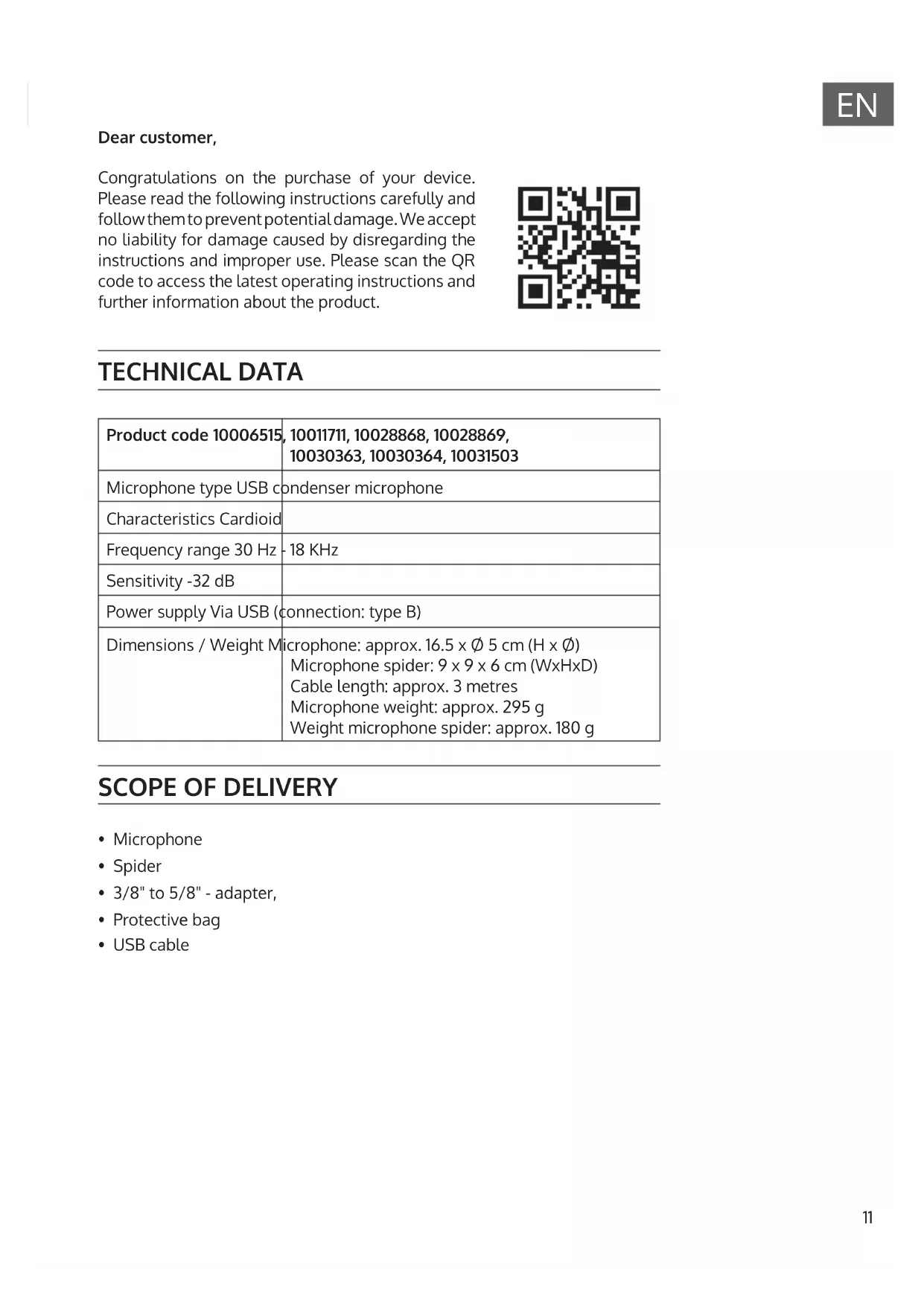 Dear customer, Congratulations on the purchase of your device. Please read the following instructions carefully and follow them to prevent potential damage. We accept no liability for damage caused by disregarding the instructions and improper use. Please scan the QR code to access the latest operating instructions and further information about the product. TECHNICAL DATA Product code 10006515, 10011711, 10028868, 10028869, 10030363, 10030364, 10031503 Microphone type USB condenser microphone Characteristics Cardioid Frequency range 30 Hz - 18 KHz Sensitivity -32 dB Power supply Via USB (connection: type B) Dimensions / Weight Microphone: approx. 16.5 x Ø 5 cm (H x Ø) Microphone spider: 9 x 9 x 6 cm (WxHxD) Cable length: approx. 3 metres Microphone weight: approx. 295 g Weight microphone spider: approx. 180 g