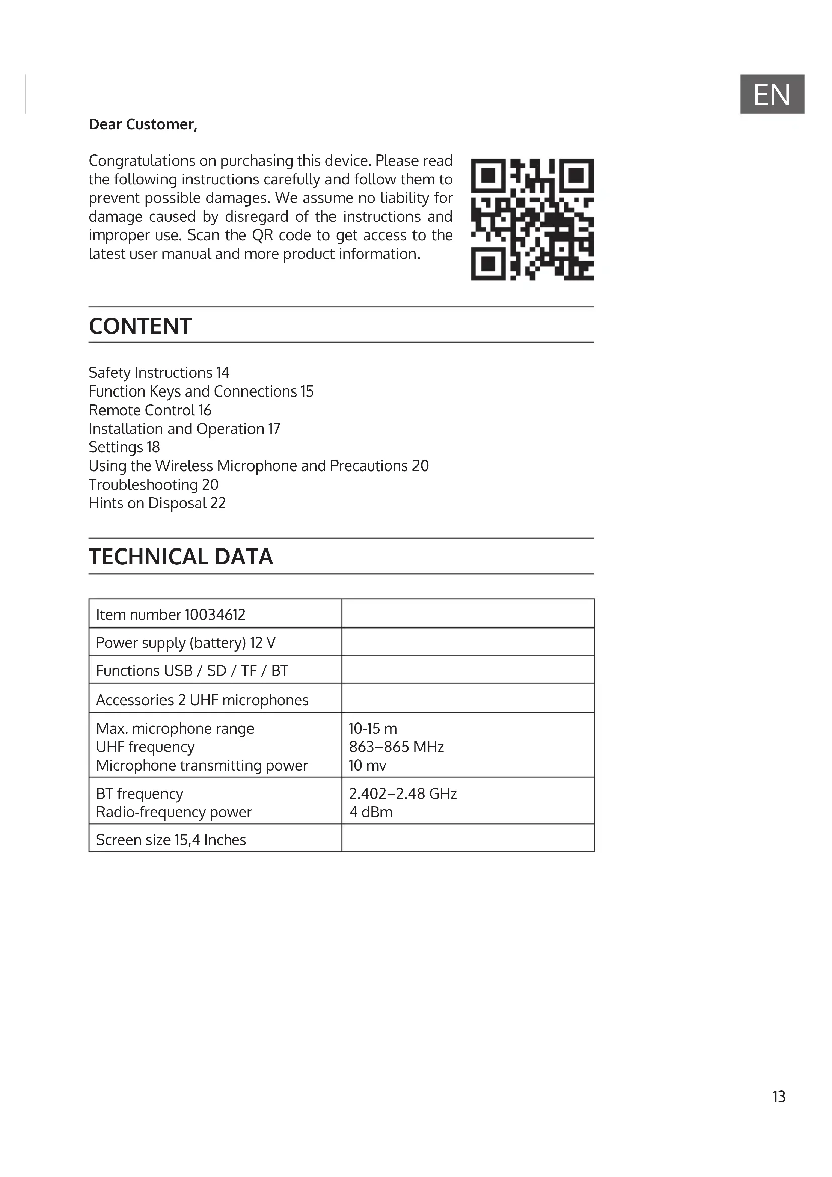 Dear Customer, Congratulations on purchasing this device. Please read the following instructions carefully and follow them to prevent possible damages. We assume no liability for damage caused by disregard of the instructions and improper use. Scan the QR code to get access to the latest user manual and more product information. CONTENT Safety Instructions 14 Function Keys and Connections 15 Remote Control 16 Installation and Operation 17 Settings 18 Using the Wireless Microphone and Precautions 20 Troubleshooting 20 Hints on Disposal 22 TECHNICAL DATA Item number 10034612 Power supply (battery) 12 V Functions USB / SD / TF / BT Accessories 2 UHF microphones Max. microphone range UHF frequency Microphone transmitting power 10-15 m 863–865 MHz 10 mv BT frequency Radio-frequency power 2.402–2.48 GHz 4 dBm Screen size 15,4 Inches14