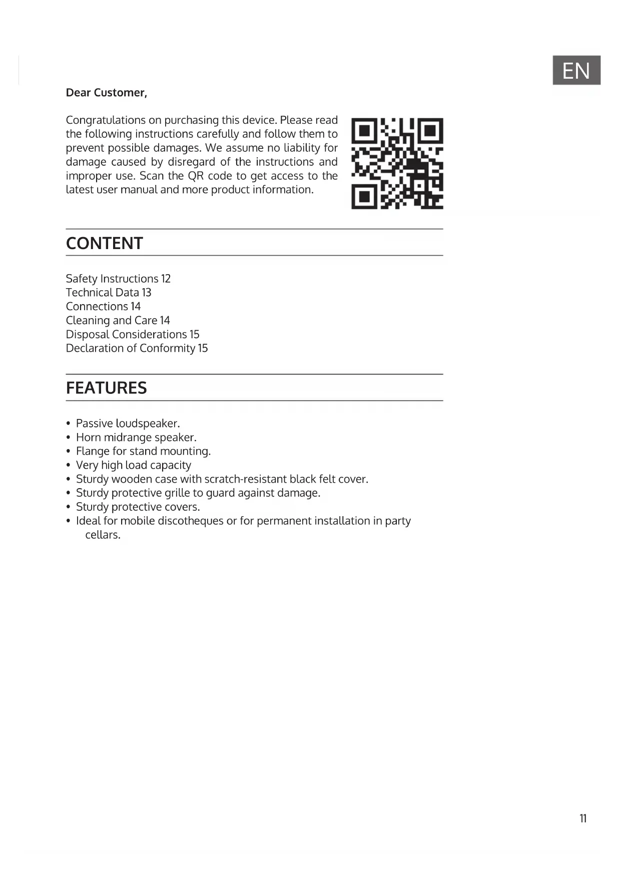 Dear Customer, Congratulations on purchasing this device. Please read the following instructions carefully and follow them to prevent possible damages. We assume no liability for damage caused by disregard of the instructions and improper use. Scan the QR code to get access to the latest user manual and more product information. CONTENT Safety Instructions 12 Technical Data 13 Connections 14 Cleaning and Care 14 Disposal Considerations 15 Declaration of Conformity 15 FEATURES