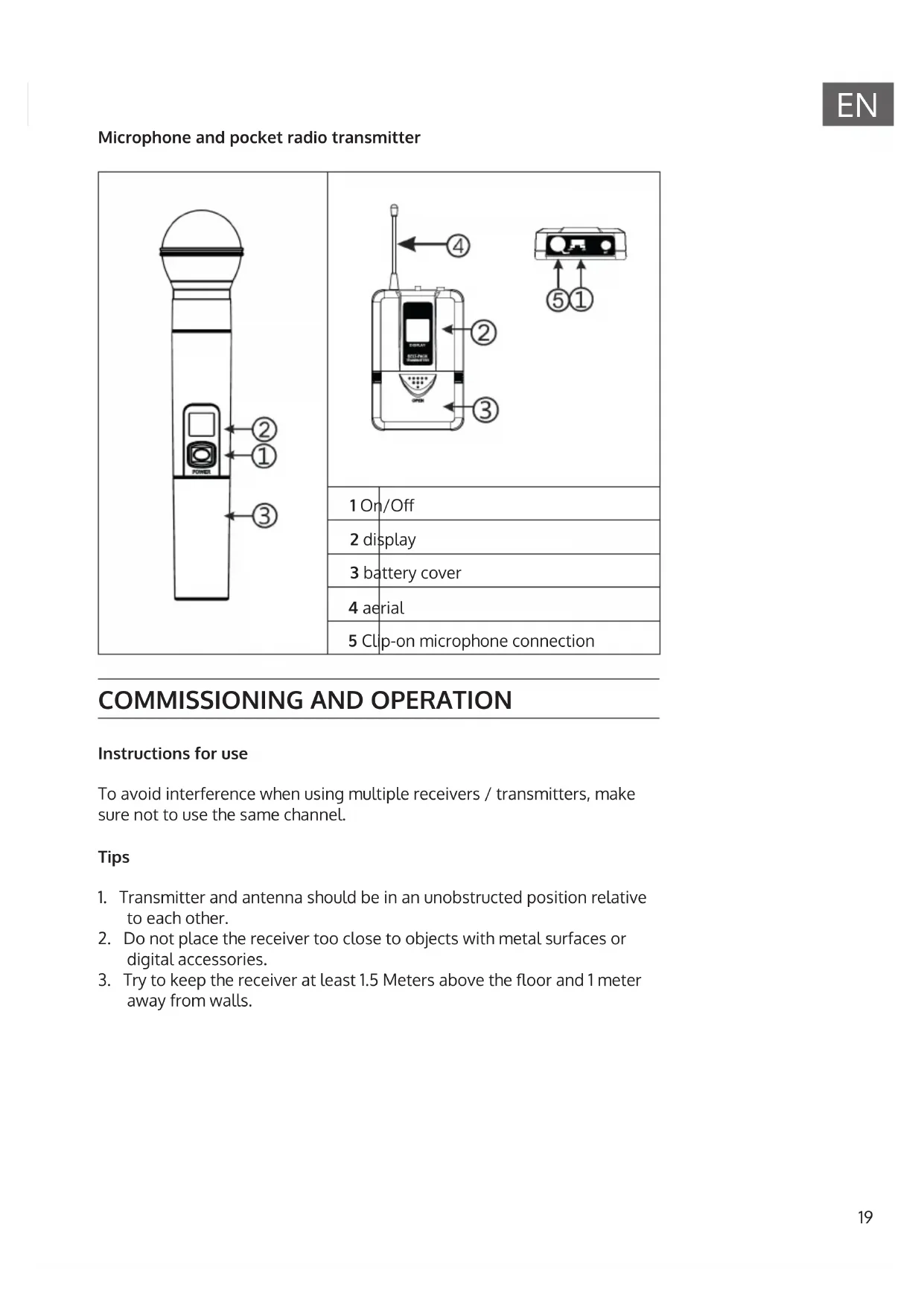 Microphone and pocket radio transmitter 1 On/O 2 display 3 battery cover 4 aerial 5 Clip-on microphone connection