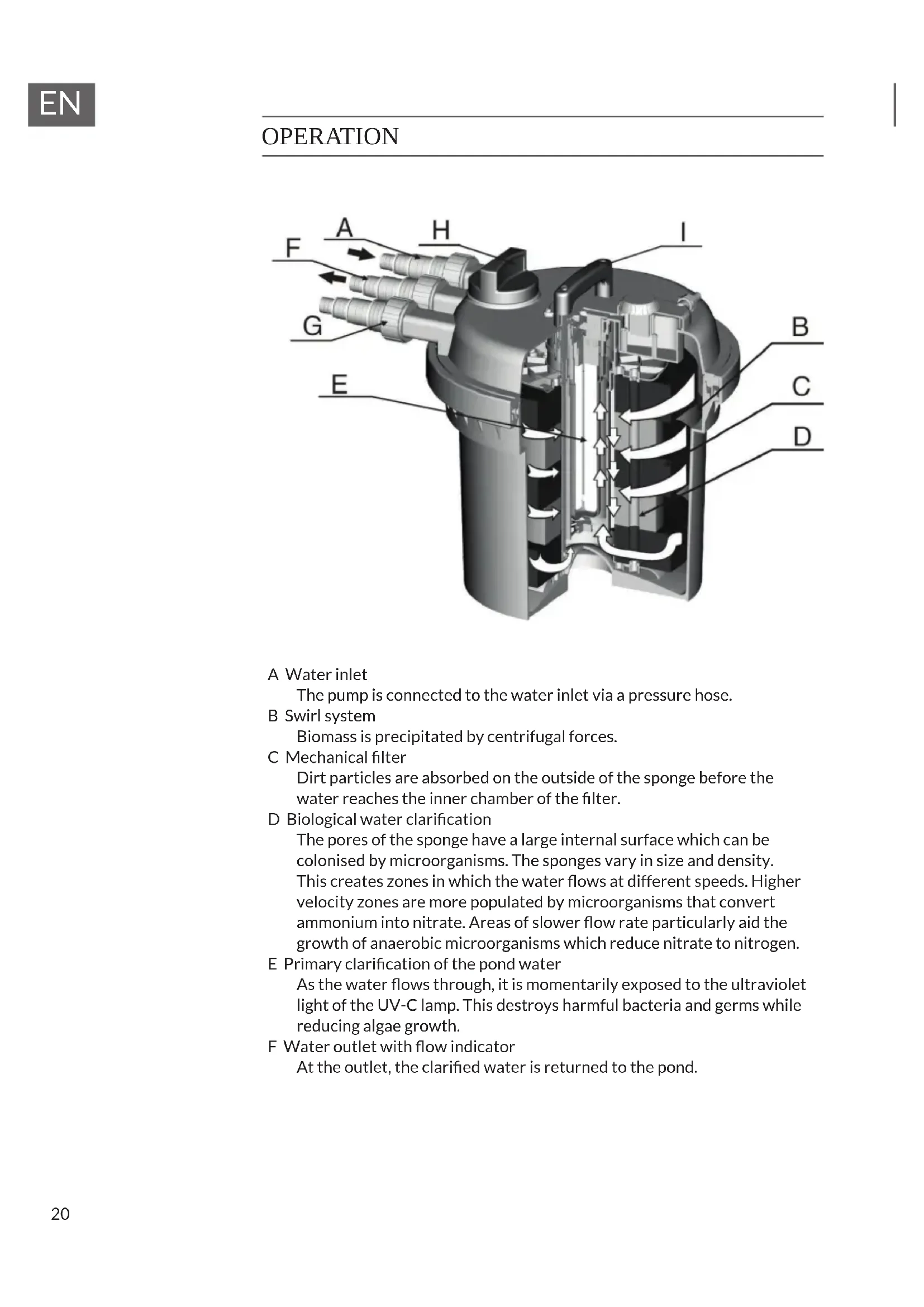 OPERATION A Water inlet The pump is connected to the water inlet via a pressure hose. B Swirl system Biomass is precipitated by centrifugal forces. C Mechanical lter Dirt particles are absorbed on the outside of the sponge before the water reaches the inner chamber of the lter. D Biological water clarication The pores of the sponge have a large internal surface which can be colonised by microorganisms. The sponges vary in size and density. This creates zones in which the water ows at different speeds. Higher velocity zones are more populated by microorganisms that convert ammonium into nitrate. Areas of slower ow rate particularly aid the growth of anaerobic microorganisms which reduce nitrate to nitrogen. E Primary clarication of the pond water As the water ows through, it is momentarily exposed to the ultraviolet light of the UV-C lamp. This destroys harmful bacteria and germs while reducing algae growth. F Water outlet with ow indicator At the outlet, the claried water is returned to the pond.21