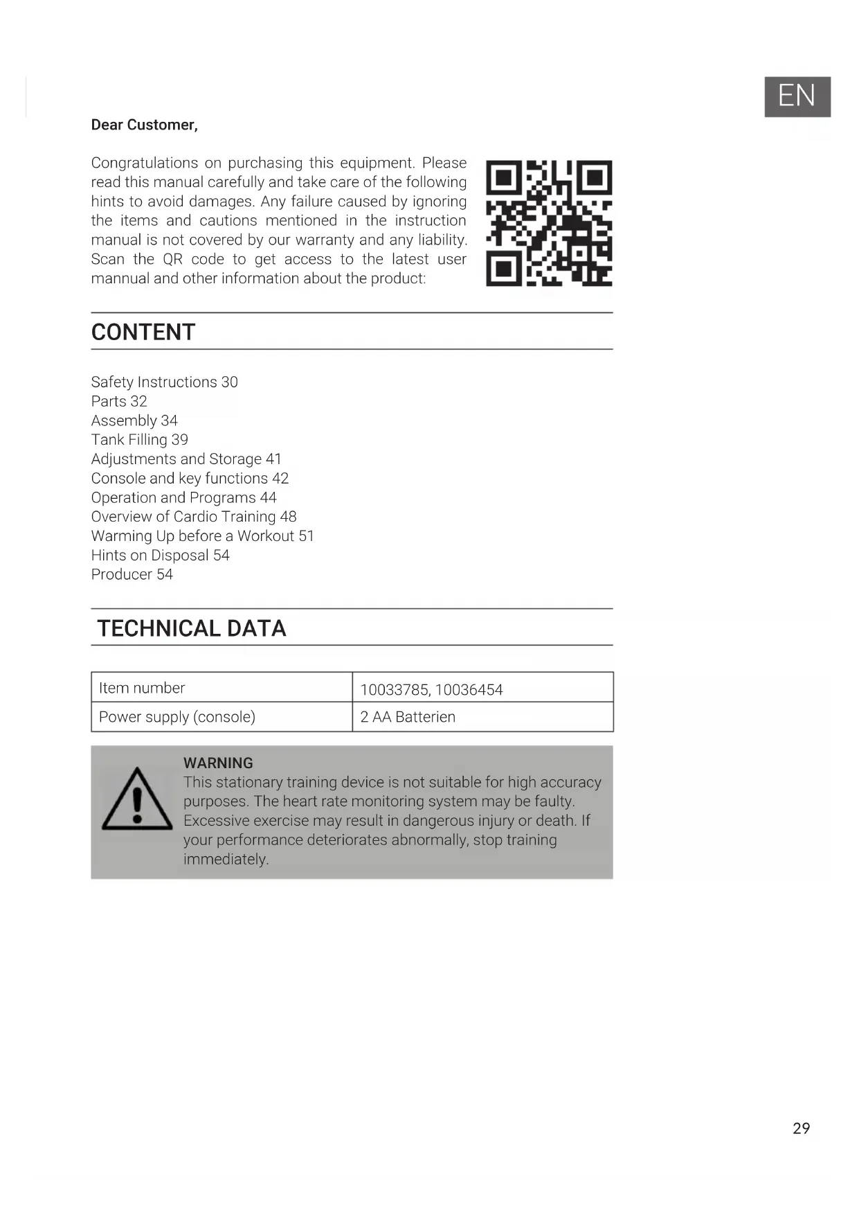 Dear Customer, Congratulations on purchasing this equipment. Please read this manual carefully and take care of the following hints to avoid damages. Any failure caused by ignoring the items and cautions mentioned in the instruction manual is not covered by our warranty and any liability. Scan the QR code to get access to the latest user mannual and other information about the product: CONTENT Safety Instructions 30 Parts 32 Assembly 34 Tank Filling 39 Adjustments and Storage 41 Console and key functions 42 Operation and Programs 44 Overview of Cardio Training 48 Warming Up before a Workout 51 Hints on Disposal 54 Producer 54 TECHNICAL DATA Item number 10033785, 10036454 Power supply (console) 2 AA Batterien WARNING This stationary training device is not suitable for high accuracy purposes. The heart rate monitoring system may be faulty. Excessive exercise may result in dangerous injury or death. If your performance deteriorates abnormally, stop training immediately.30