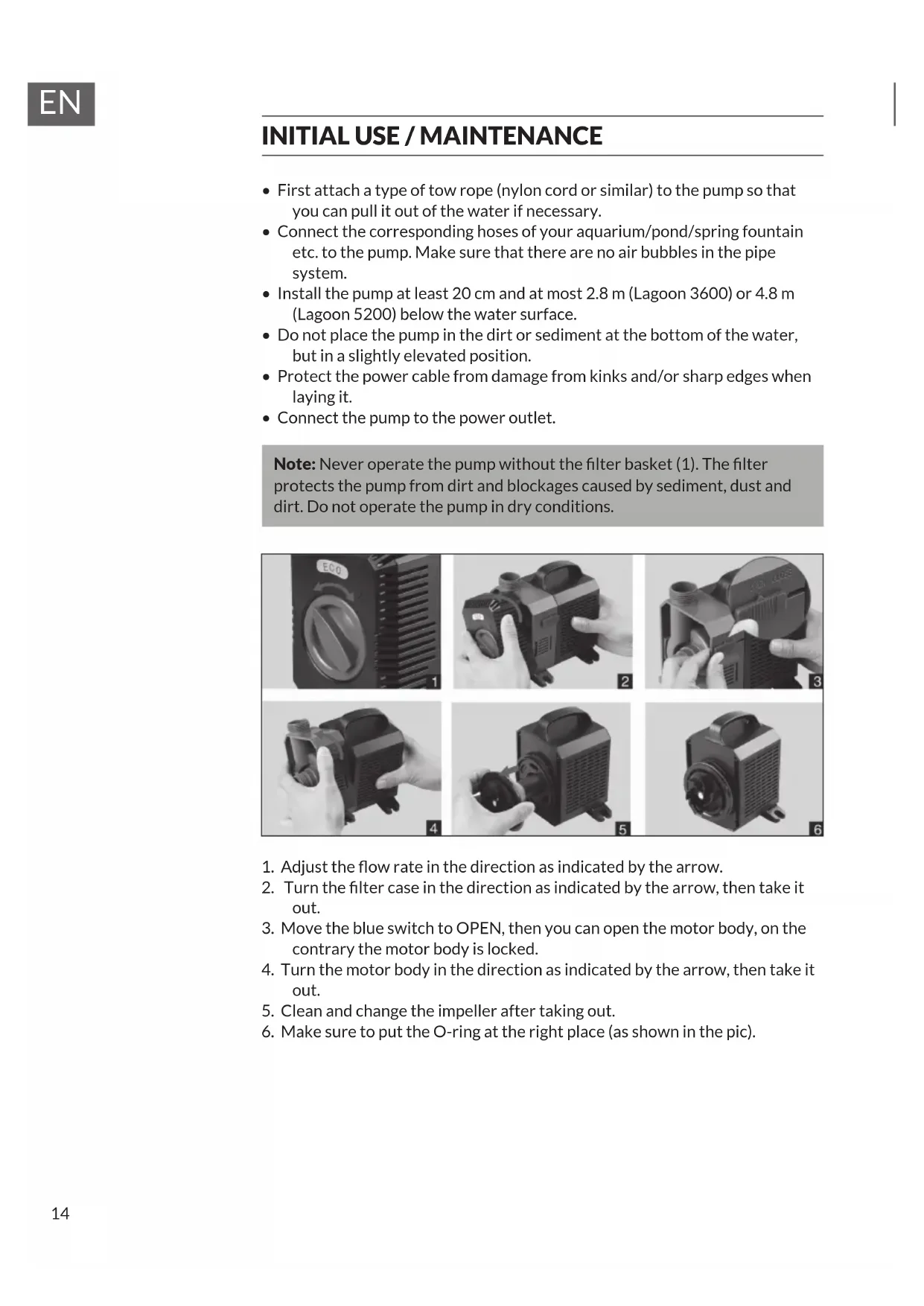 Dear Customer, Congratulations on purchasing this equipment. Please read this manual carefully and take care of the following hints to avoid damages. Any failure caused by ignoring the items and cautions mentioned in the instruction manual is not covered by our warranty and any liability. Scan the QR code to get access to the latest user mannual and other information about the product. CONTENT Safety Instructions 12 Product Overview 13 Initial Use / Maintenance 14 Troubleshooting 15 Disposal Considerations 16 Manufacturer & Importer (UK) 16 TECHNICAL DATA Item Lagoon 3000 Lagoon 4500 Power supply 220 V ~ 50 Hz 220 V ~ 50 Hz Power consumtion 10 W 30 W Maximum head 2 m 4 m Flow rate 3000 Liter/hour 4500 Liter/hour Item Lagoon 3600 Lagoon 5600 Power supply 220 V ~ 50 Hz 220 V ~ 50 Hz Power consumtion 20 W 40 W Maximum head 2.8 m 4.8 m Flow rate 3600 liter/hour 5200 liter/Hour12
