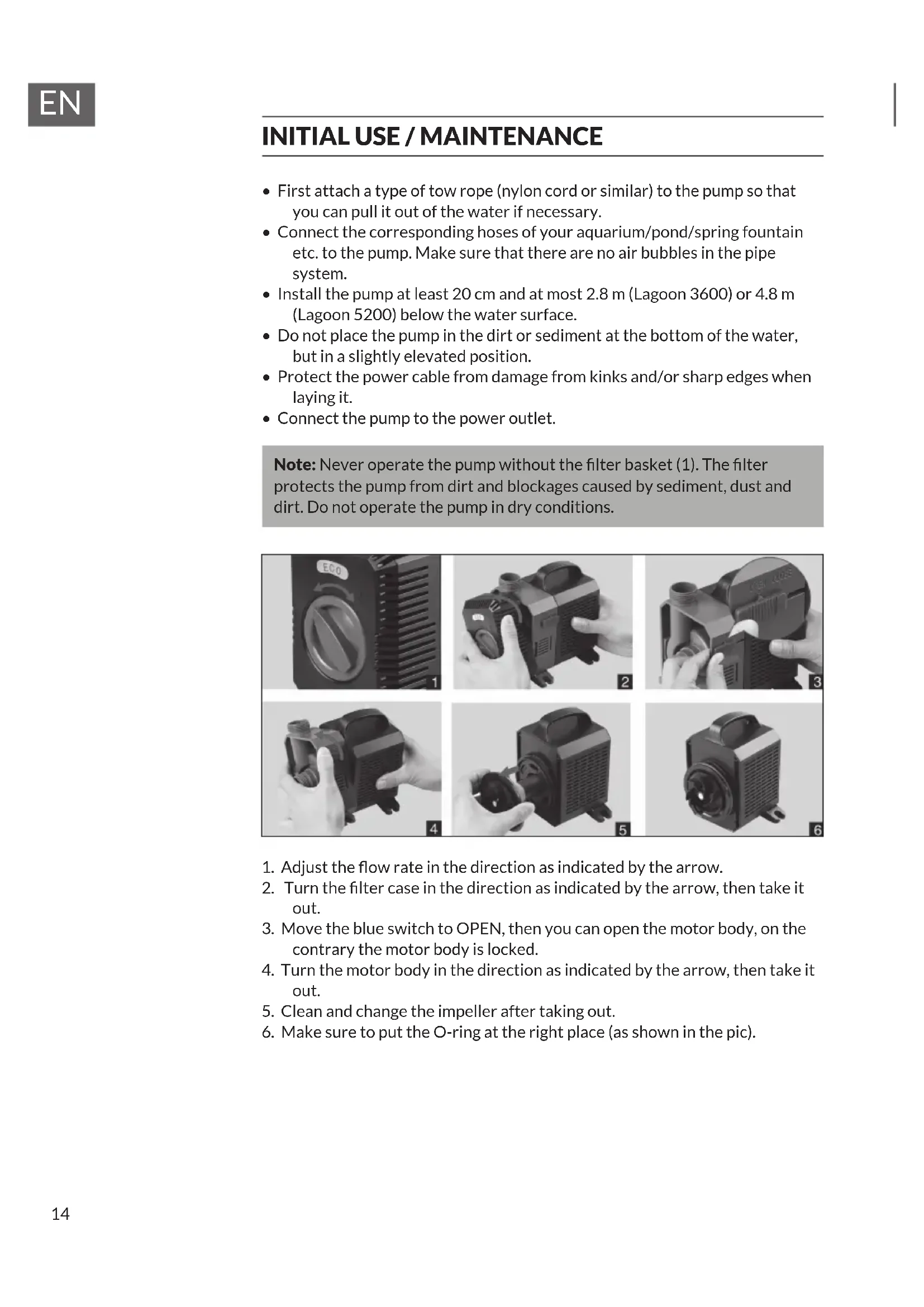 - Do not let the pump run dry. WARNING Risk of injury! Never open the motor housing, otherwise there is a danger to life.13