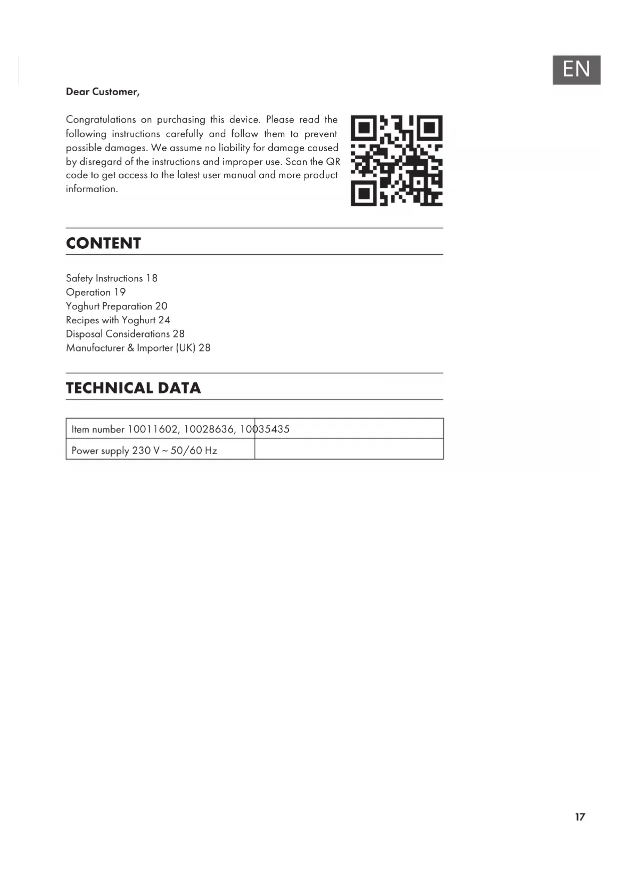 Dear Customer, Congratulations on purchasing this device. Please read the following instructions carefully and follow them to prevent possible damages. We assume no liability for damage caused by disregard of the instructions and improper use. Scan the QR code to get access to the latest user manual and more product information. CONTENT Safety Instructions18 Operation19 Yoghurt Preparation20 Recipes with Yoghurt24 Disposal Considerations28 Manufacturer & Importer (UK)28 TECHNICAL DATA Item number 10011602, 10028636, 10035435 Power supply 230 V ~ 50/60 Hz18