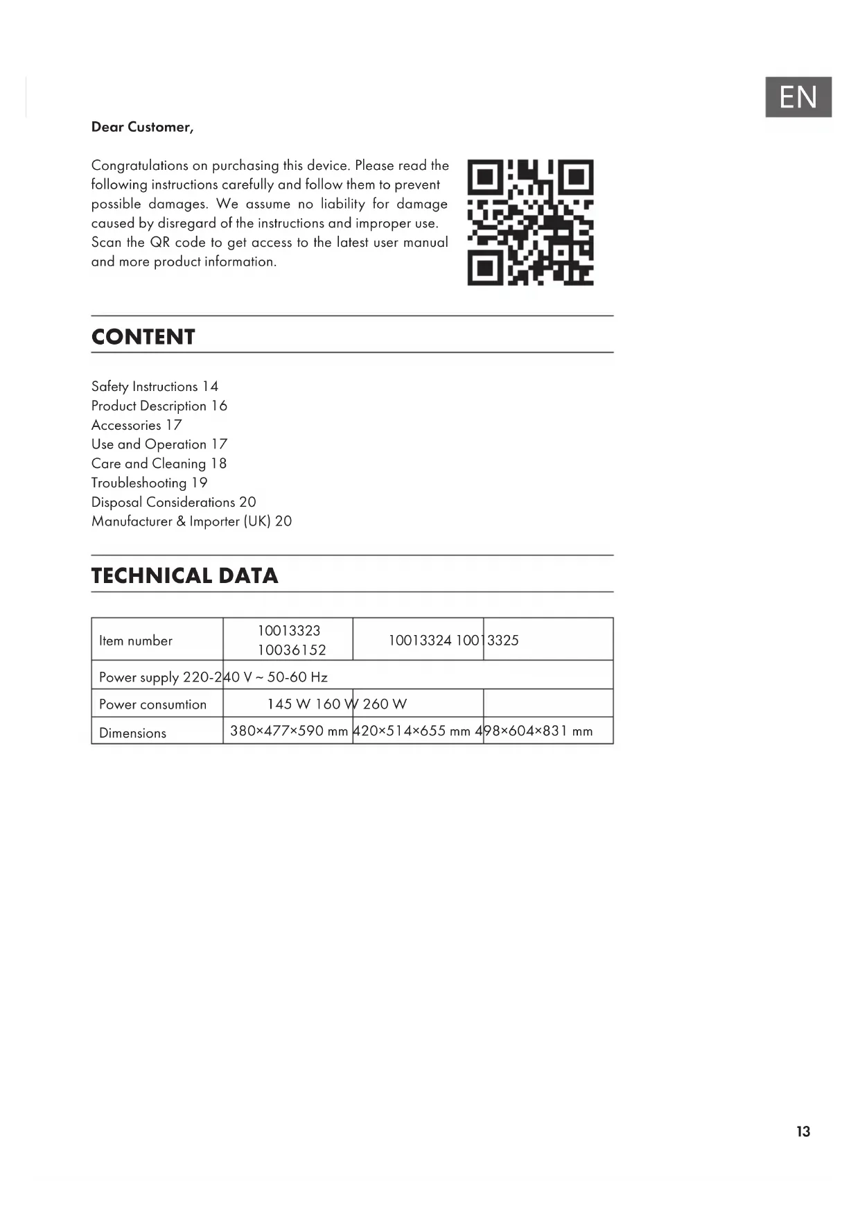 Dear Customer, Congratulations on purchasing this device. Please read the following instructions carefully and follow them to prevent possible damages. We assume no liability for damage caused by disregard of the instructions and improper use. Scan the QR code to get access to the latest user manual and more product information. CONTENT Safety Instructions14 Product Description16 Accessories17 Use and Operation17 Care and Cleaning18 Troubleshooting19 Disposal Considerations20 Manufacturer & Importer (UK)20 TECHNICAL DATA Item number