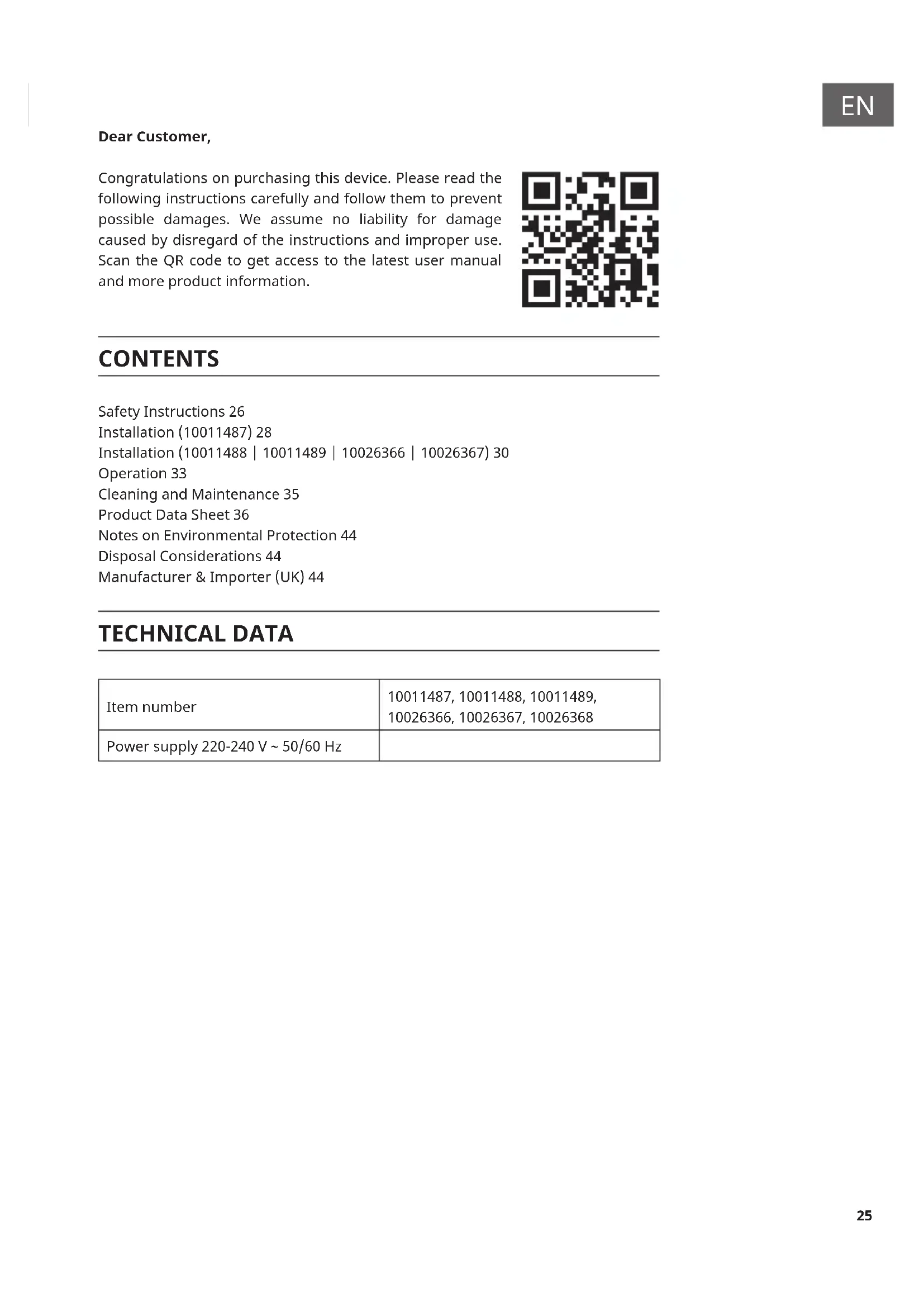 Dear Customer, Congratulations on purchasing this device. Please read the following instructions carefully and follow them to prevent possible damages. We assume no liability for damage caused by disregard of the instructions and improper use. Scan the QR code to get access to the latest user manual and more product information. CONTENTS Safety Instructions 26 Installation (10011487) 28 Installation (10011488 | 10011489 | 10026366 | 10026367) 30 Operation 33 Cleaning and Maintenance 35 Product Data Sheet 36 Notes on Environmental Protection 44 Disposal Considerations 44 Manufacturer & Importer (UK) 44 TECHNICAL DATA Item number 10011487, 10011488, 10011489, 10026366, 10026367, 10026368 Power supply 220-240 V ~ 50/60 Hz26