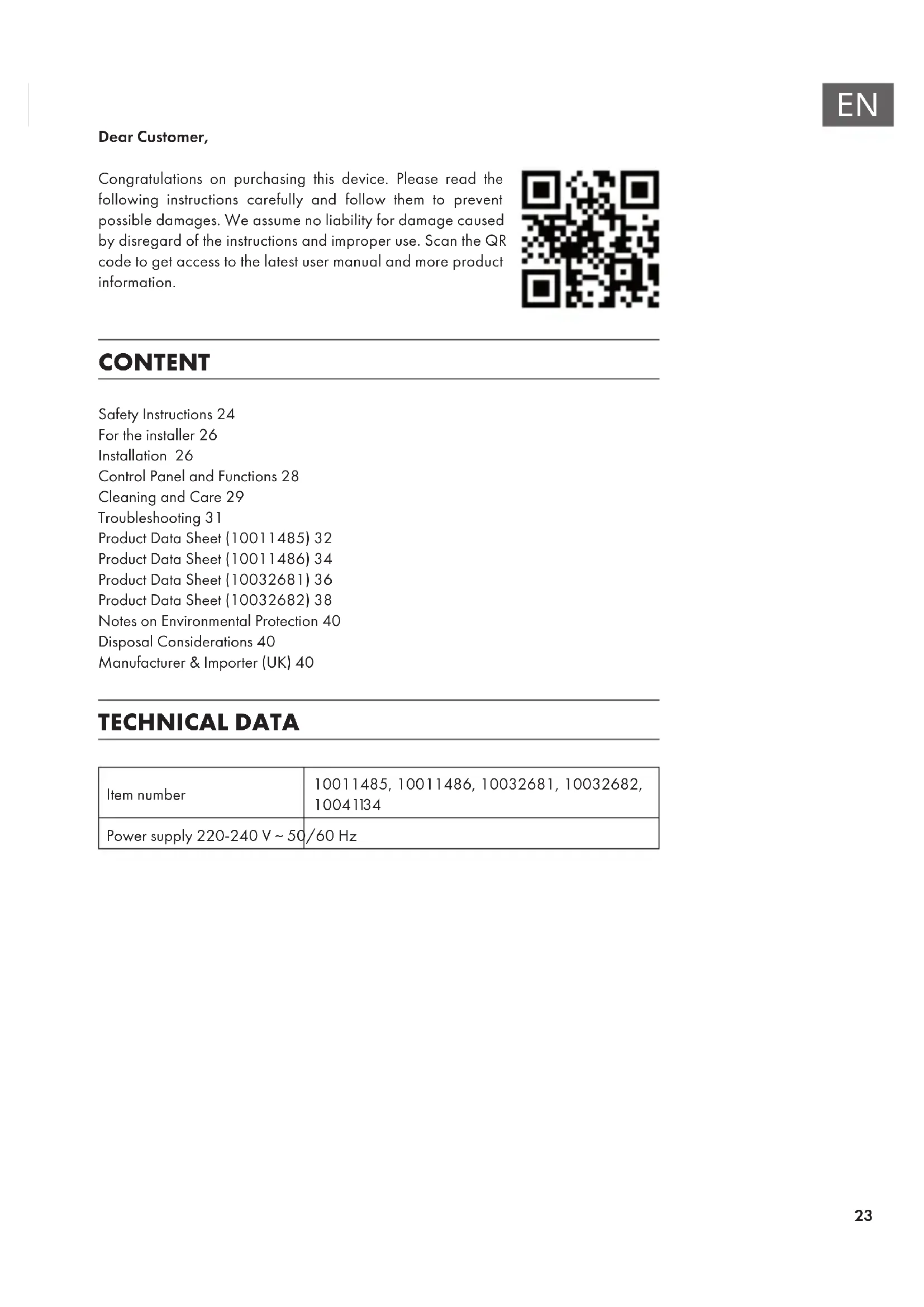 Dear Customer, Congratulations on purchasing this device. Please read the following instructions carefully and follow them to prevent possible damages. We assume no liability for damage caused by disregard of the instructions and improper use. Scan the QR code to get access to the latest user manual and more product information. CONTENT Safety Instructions24 For the installer26 Installation 26 Control Panel and Functions28 Cleaning and Care29 Troubleshooting31 Product Data Sheet (10011485)32 Product Data Sheet (10011486)34 Product Data Sheet (10032681)36 Product Data Sheet (10032682)38 Notes on Environmental Protection40 Disposal Considerations40 Manufacturer & Importer (UK)40 TECHNICAL DATA Item number 10011485, 10011486, 10032681, 10032682,