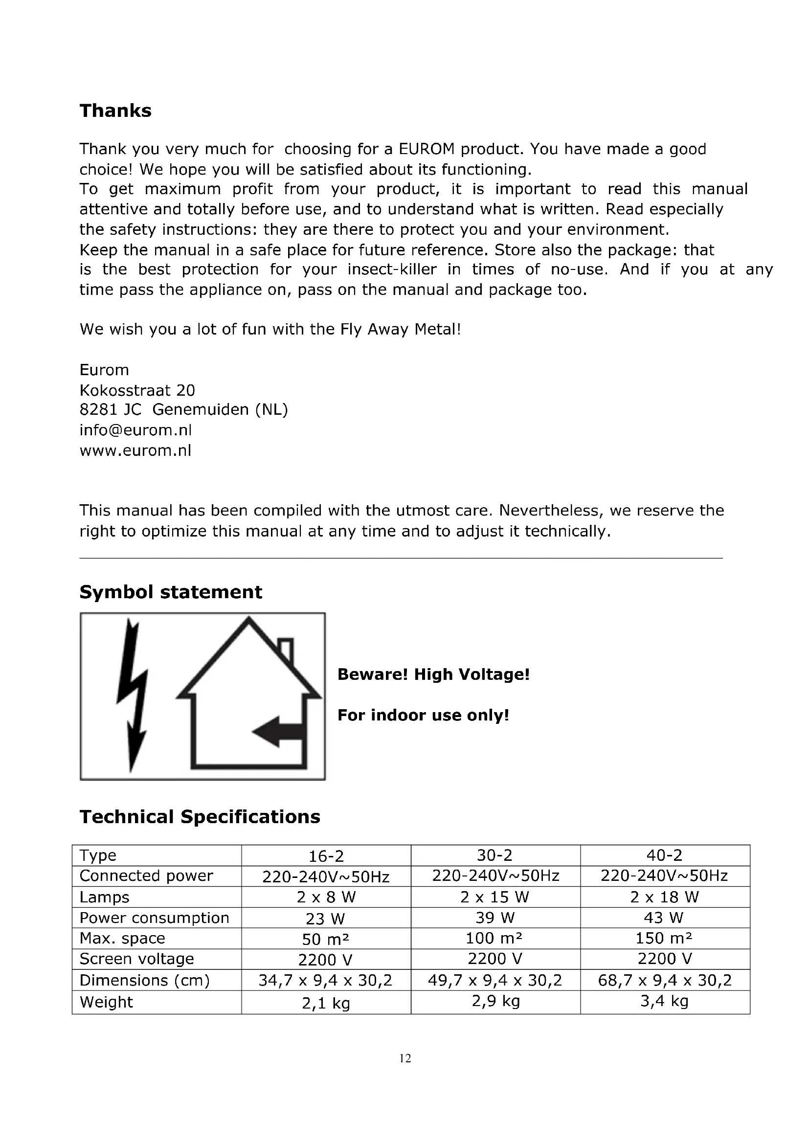 Thanks Thank you very much for choosing for a EUROM product. You have made a good choice! We hope you will be satisfied about its functioning. To get maximum profit from your product, it is important to read this manual attentive and totally before use, and to understand what is written. Read especially the safety instructions: they are there to protect you and your environment. Keep the manual in a safe place for future reference. Store also the package: that is the best protection for your insect-killer in times of no-use. And if you at any time pass the appliance on, pass on the manual and package too. We wish you a lot of fun with the Fly Away Metal! Eurom Kokosstraat 20 8281 JC Genemuiden (NL) info@eurom.nl www.eurom.nl