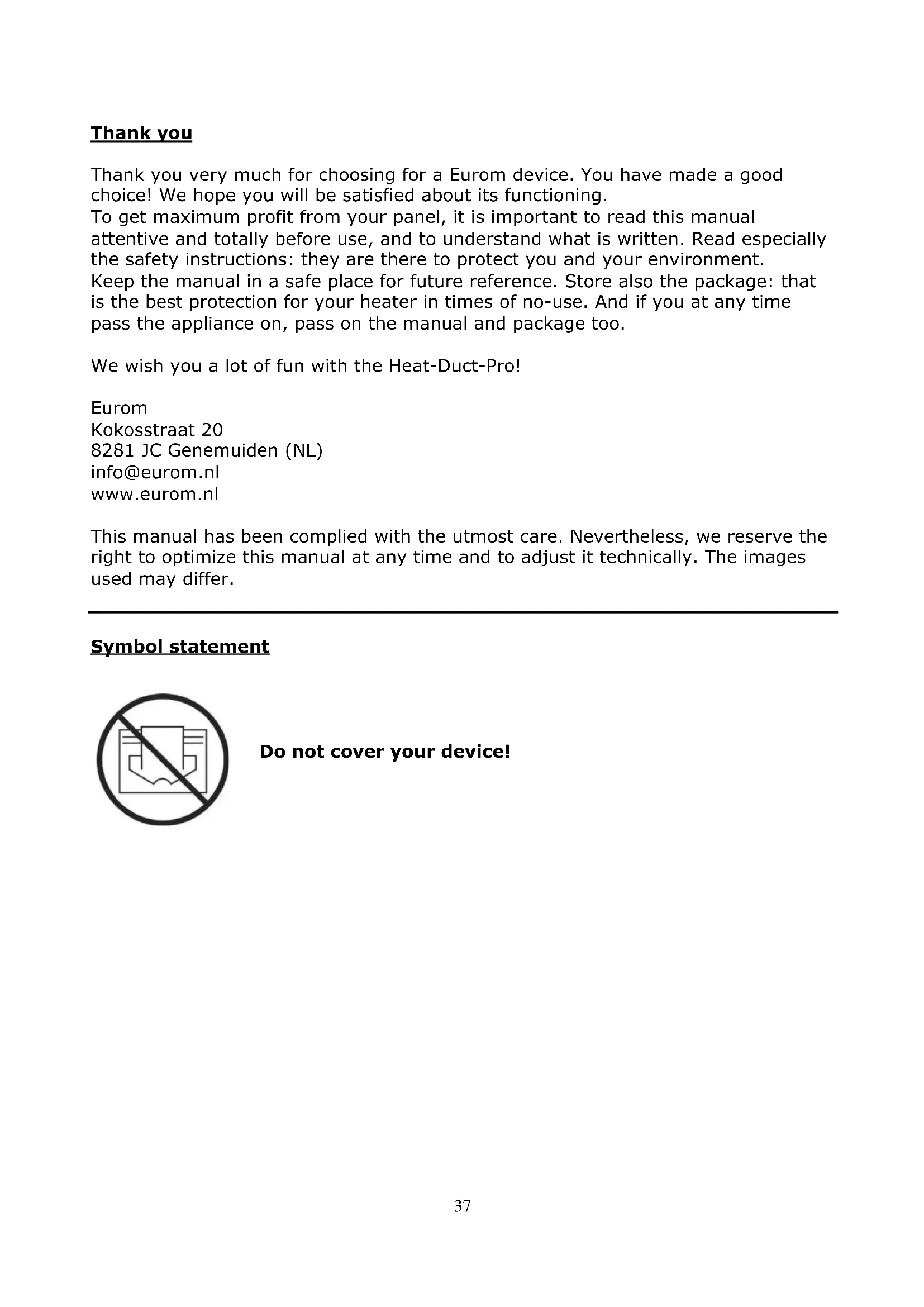 CE - Erklärung Sehe seite 102.37 Thank you Thank you very much for choosing for a Eurom device. You have made a good choice! We hope you will be satisfied about its functioning. To get maximum profit from your panel, it is important to read this manual attentive and totally before use, and to understand what is written. Read especially the safety instructions: they are there to protect you and your environment. Keep the manual in a safe place for future reference. Store also the package: that is the best protection for your heater in times of no-use. And if you at any time pass the appliance on, pass on the manual and package too. We wish you a lot of fun with the Heat-Duct-Pro! Eurom Kokosstraat 20 8281 JC Genemuiden (NL) info@eurom.nl www.eurom.nl This manual has been complied with the utmost care. Nevertheless, we reserve the right to optimize this manual at any time and to adjust it technically. The images used may differ.