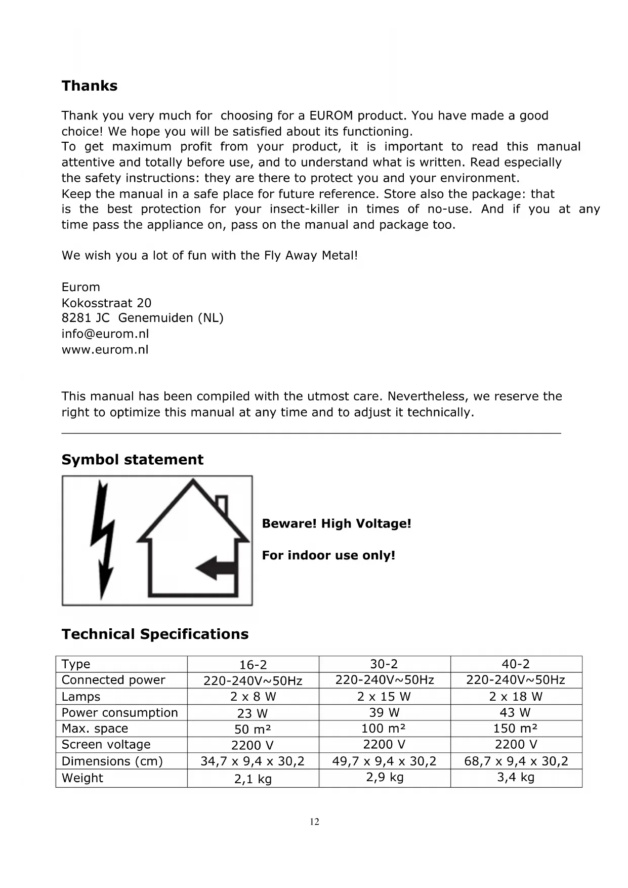 Thanks Thank you very much for choosing for a EUROM product. You have made a good choice! We hope you will be satisfied about its functioning. To get maximum profit from your product, it is important to read this manual attentive and totally before use, and to understand what is written. Read especially the safety instructions: they are there to protect you and your environment. Keep the manual in a safe place for future reference. Store also the package: that is the best protection for your insect-killer in times of no-use. And if you at any time pass the appliance on, pass on the manual and package too. We wish you a lot of fun with the Fly Away Metal! Eurom Kokosstraat 20 8281 JC Genemuiden (NL) info@eurom.nl www.eurom.nl
