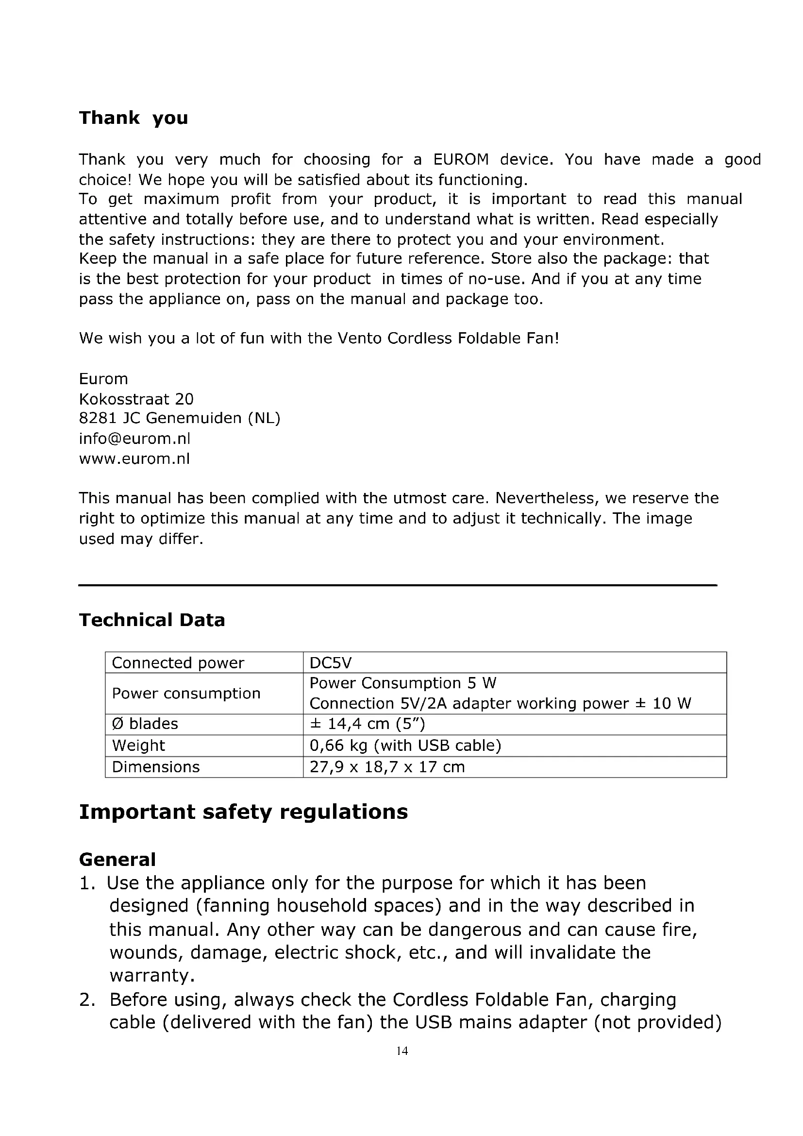 Thank you Thank you very much for choosing for a EUROM device. You have made a good choice! We hope you will be satisfied about its functioning. To get maximum profit from your product, it is important to read this manual attentive and totally before use, and to understand what is written. Read especially the safety instructions: they are there to protect you and your environment. Keep the manual in a safe place for future reference. Store also the package: that is the best protection for your product in times of no-use. And if you at any time pass the appliance on, pass on the manual and package too. We wish you a lot of fun with the Vento Cordless Foldable Fan! Eurom Kokosstraat 20 8281 JC Genemuiden (NL) info@eurom.nl www.eurom.nl This manual has been complied with the utmost care. Nevertheless, we reserve the right to optimize this manual at any time and to adjust it technically. The image used may differ.