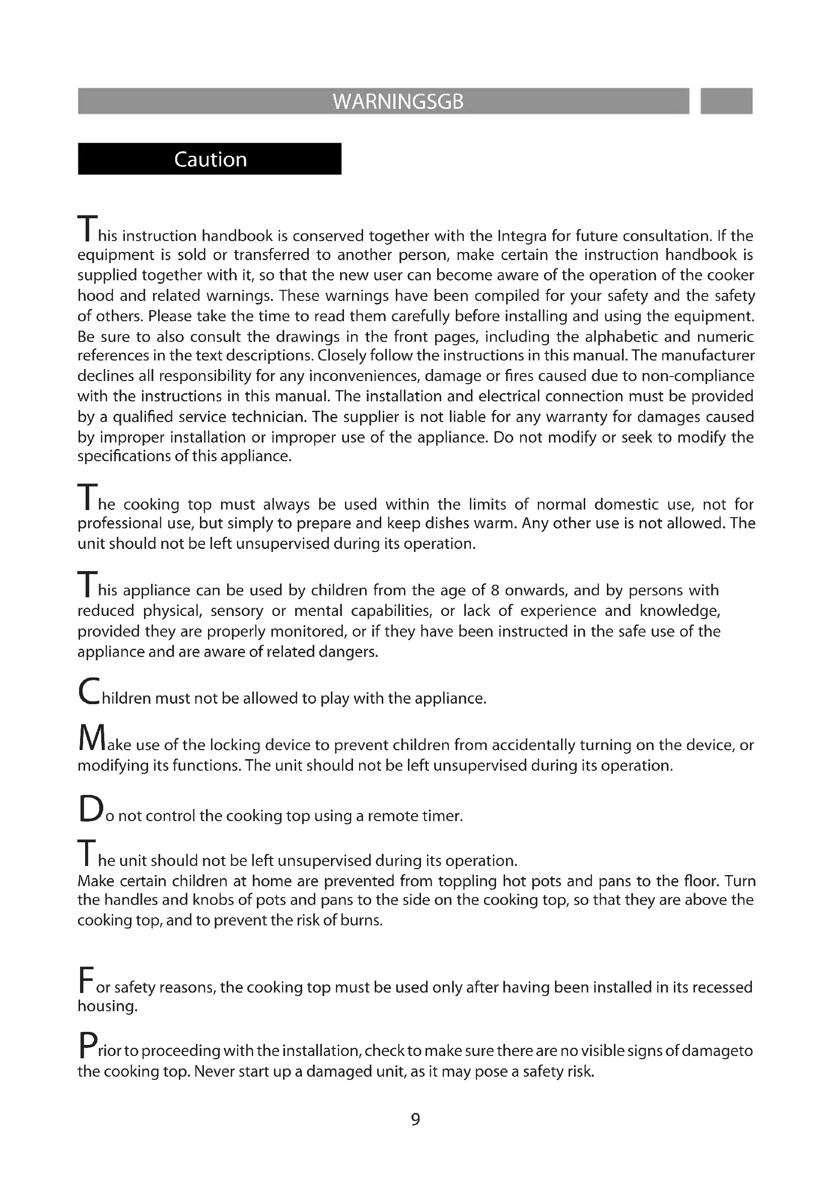 his instruction handbook is conserved together with the Integra for future consultation. If the equipment is sold or transferred to another person, make certain the instruction handbook is supplied together with it, so that the new user can become aware of the operation of the cooker hood and related warnings. These warnings have been compiled for your safety and the safety of others. Please take the time to read them carefully before installing and using the equipment. Be sure to also consult the drawings in the front pages, including the alphabetic and numeric references in the text descriptions. Closely follow the instructions in this manual. The manufacturer declines all responsibility for any inconveniences, damage or res caused due to non-compliance with the instructions in this manual. The installation and electrical connection must be provided by a qualied service technician. The supplier is not liable for any warranty for damages caused by improper installation or improper use of the appliance. Do not modify or seek to modify the specications of this appliance.