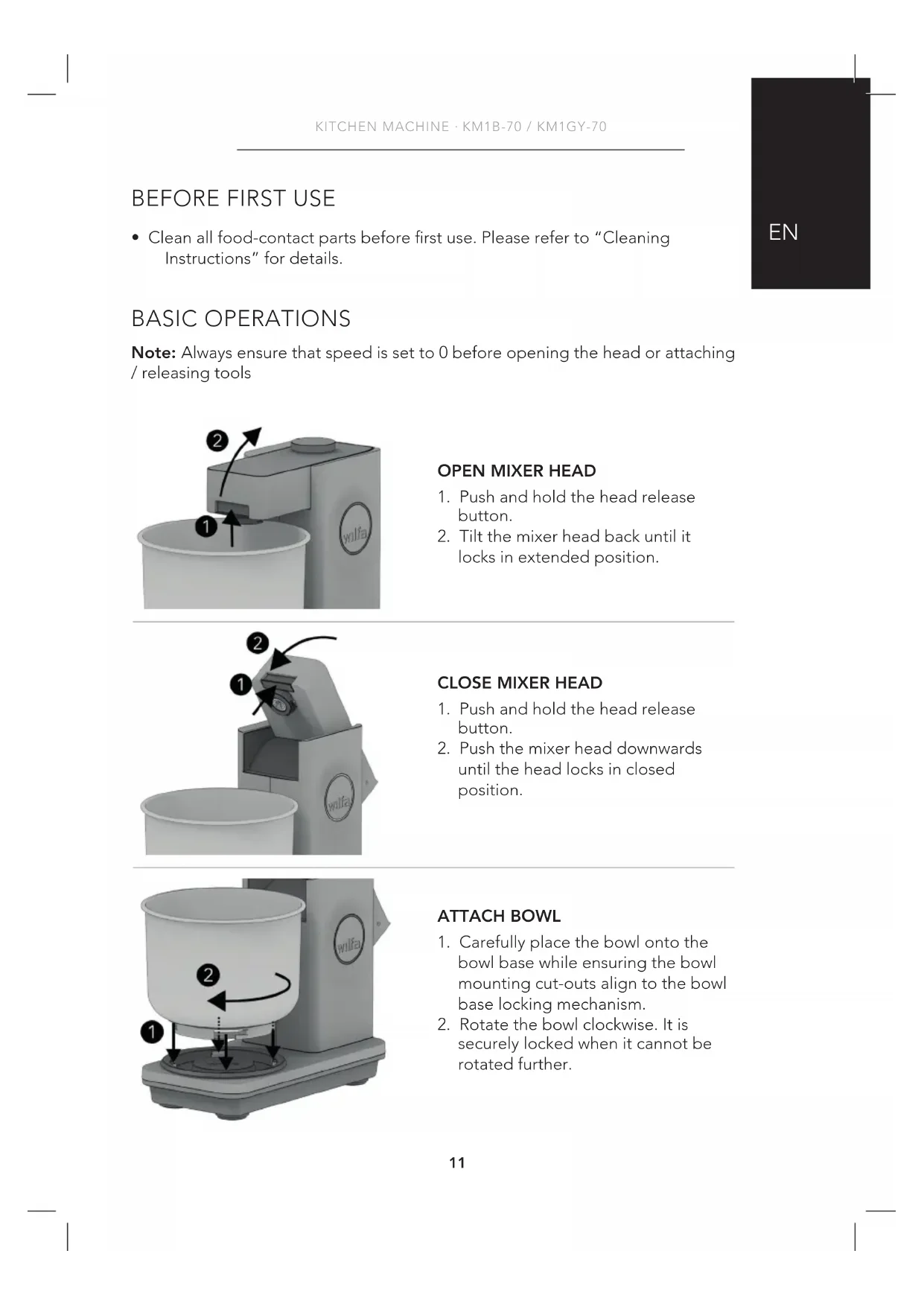 - Clean all food-contact parts before first use. Please refer to “Cleaning Instructions” for details. BASIC OPERATIONS Note: Always ensure that speed is set to 0 before opening the head or attaching / releasing tools12