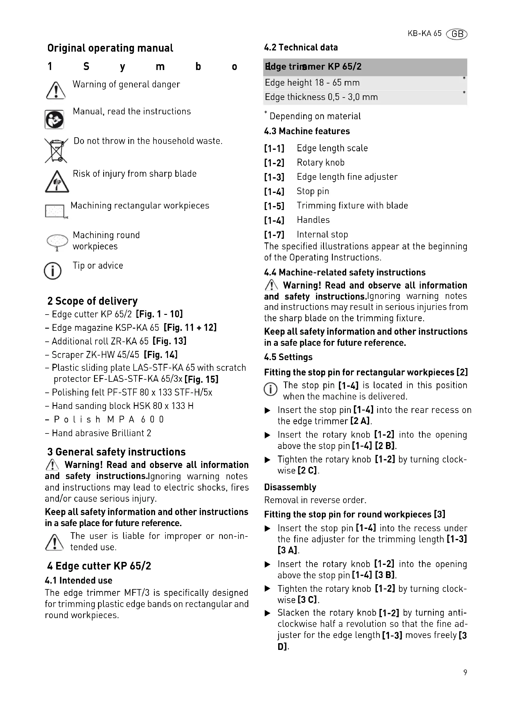 Warning of general danger Manual, read the instructions Do not throw in the household waste. Risk of injury from sharp blade Machining rectangular workpieces Machining round workpieces Tip or advice Edge trimmer KP 65/2 Edge height 18 - 65 mm