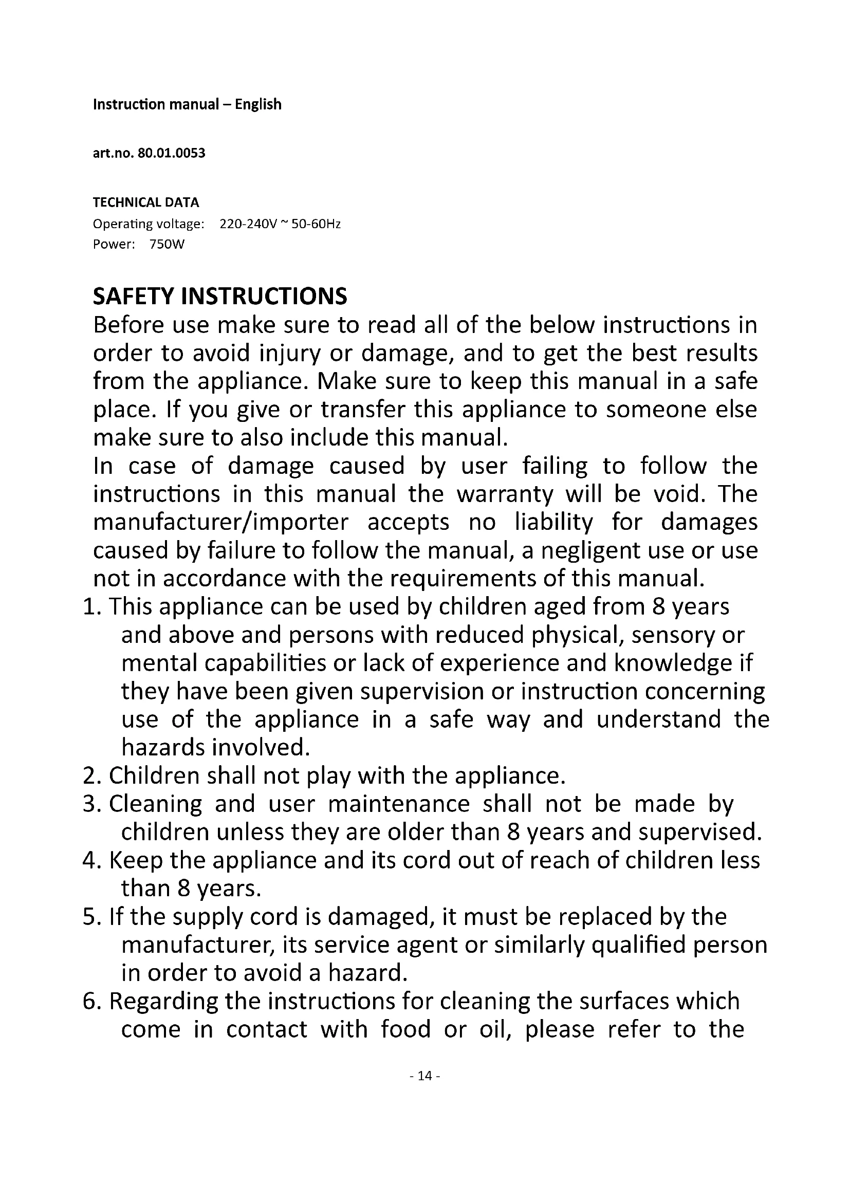 novembre 2019 Hema B.V. Boîte postale 37110 1030 AC Amsterdam Pays-Bas Ces conditions de garantie sont valables sans préjudice des droits légaux du client ou des actions intentées par lui.- 14 - Instruction manual – English art.no. 80.01.0053 TECHNICAL DATA Operating voltage: 220-240V ~ 50-60Hz Power: 750W SAFETY INSTRUCTIONS Before use make sure to read all of the below instructions in order to avoid injury or damage, and to get the best results from the appliance. Make sure to keep this manual in a safe place. If you give or transfer this appliance to someone else make sure to also include this manual. In case of damage caused by user failing to follow the instructions in this manual the warranty will be void. The manufacturer/importer accepts no liability for damages caused by failure to follow the manual, a negligent use or use not in accordance with the requirements of this manual.