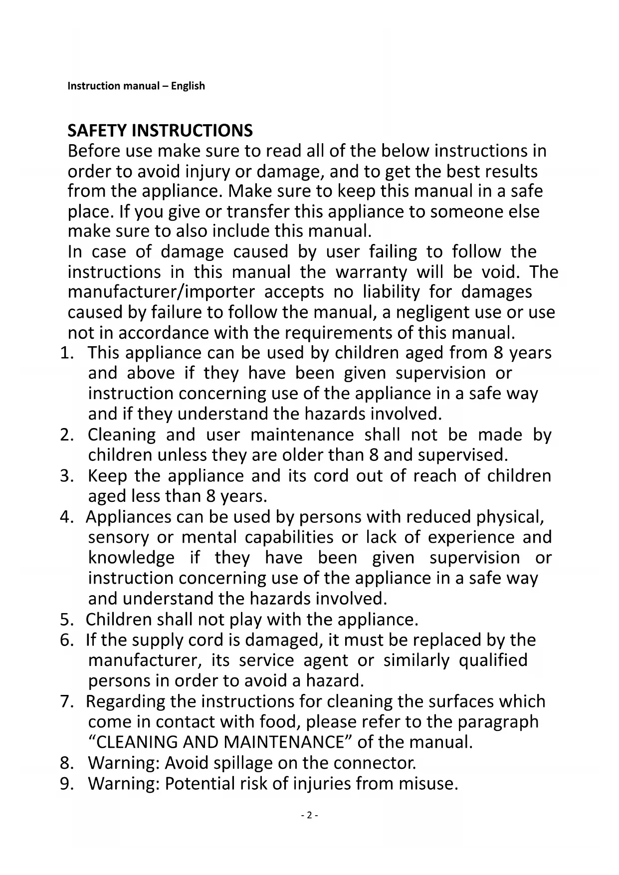 Before delivery our devices are subjected to rigorous quality control. If, despite all care, damage has occurred during production or transportation, please return the device to your dealer. In addition to statutory legal rights, the purchaser has an option to claim under the terms of the following guarantee: For the purchased device we provide 2 years guarantee, commencing from the day of sale. If you have a defective product, you can directly go back to the point of purchase.- 7 - Defects which arise due to improper handling of the device and malfunctions due to interventions and repairs by third parties or the fitting of non-original parts are not covered by this guarantee. Always keep your receipt, without the receipt you can’t claim any form of warranty. Damage caused by not following the instruction manual, will lead to a void of warranty, if this results in consequential damages then we will not be liable. Neither can we hold responsible for material damage or personal injury caused by improper use if the instruction manual is not properly executed. Damage to accessories does not mean free replacement of the whole appliance. In such case please contact our service department. Broken glass or breakage of plastic parts is always subject to a charge. Defects to consumables or parts subjected to wearing, as well as cleaning, maintenance or the replacement of said parts are not covered by the warranty and are to be paid.