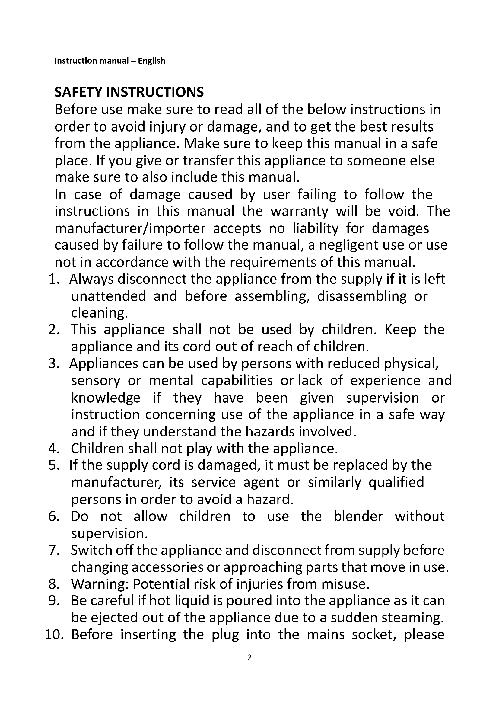 9. Be careful if hot liquid is poured into the appliance as it can