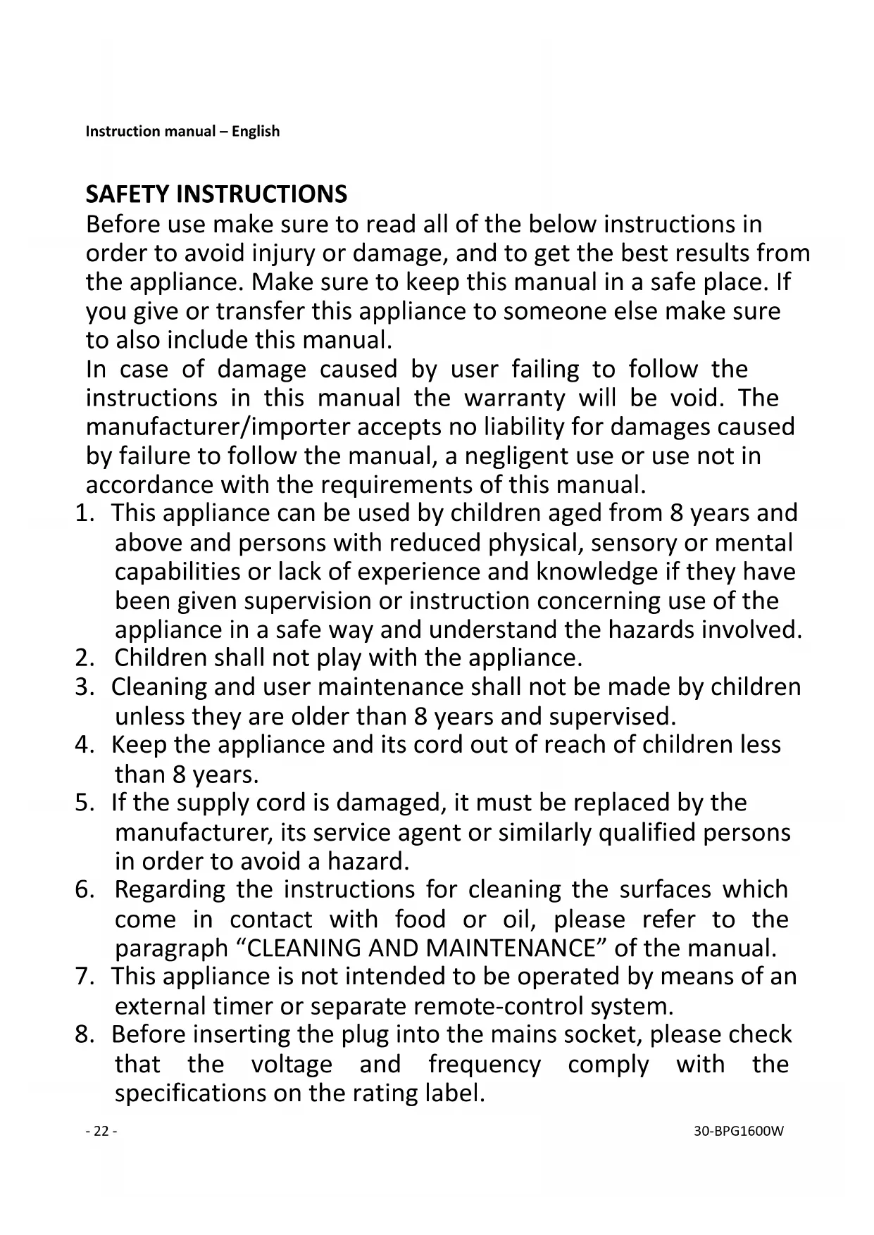 Recycling – European Directive 2012/19/EU This marking indicates that this product should not be disposed with other household wastes. To prevent possible harm to the environment or human health from uncontrolled waste disposal, recycle it responsibly to promote the sustainable reuse of material resources. To return your used device, please use the return and collection systems or contact the retailer where the product was purchased. They can take this product for environmental safe recycling. Fun Nordic ApS Egelund 8 6200 Aabenraa Denmark www.funnordic.dk- 27 - 30-BPG1600W Mode d'emploi – French