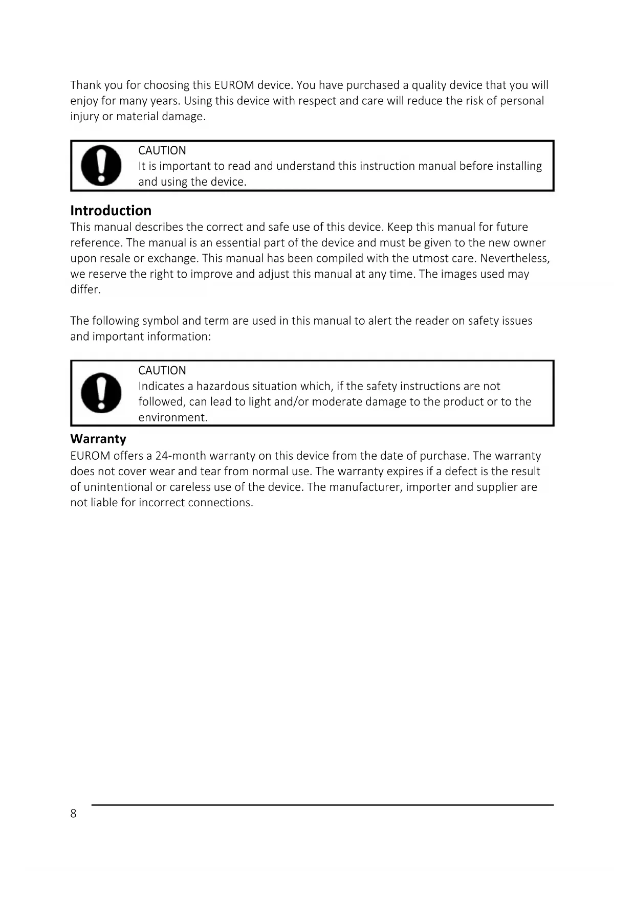 CAUTION It is important to read and understand this instruction manual before installing and using the device. Introduction This manual describes the correct and safe use of this device. Keep this manual for future reference. The manual is an essential part of the device and must be given to the new owner upon resale or exchange. This manual has been compiled with the utmost care. Nevertheless, we reserve the right to improve and adjust this manual at any time. The images used may differ. The following symbol and term are used in this manual to alert the reader on safety issues and important information: