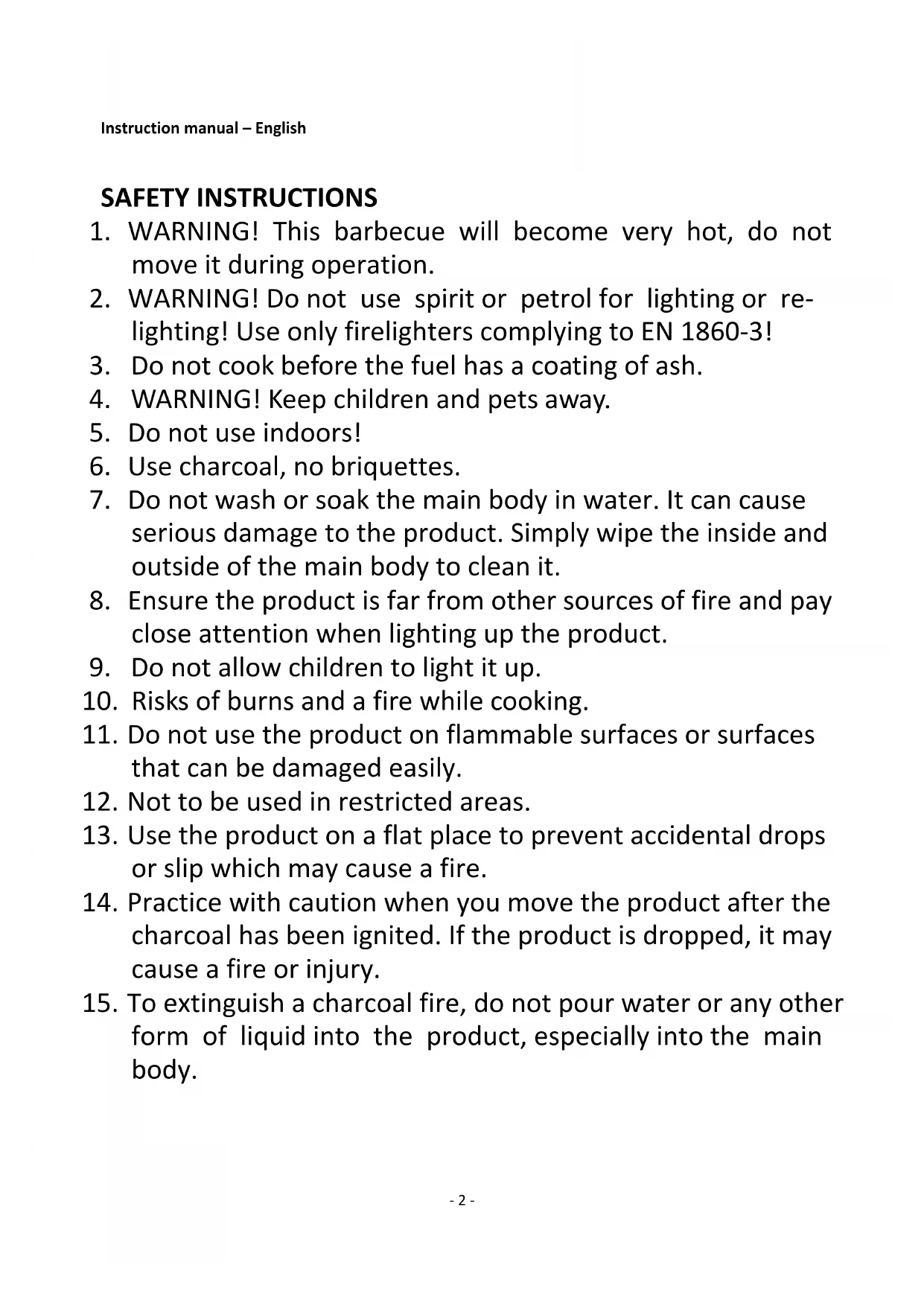 2. WARNING! Do not use spirit or petrol for lighting or re-
