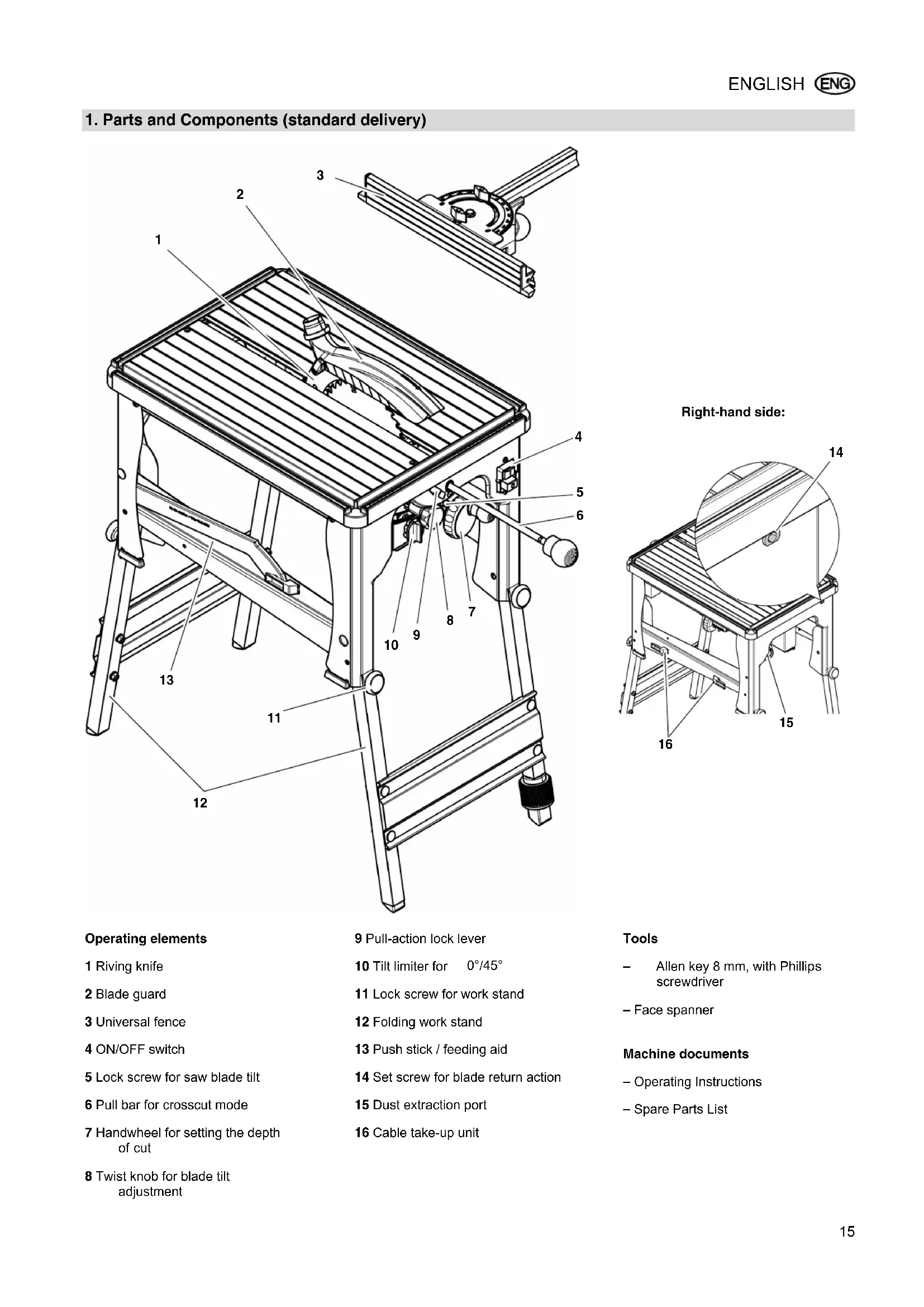 cut 8 Twist knob for blade tilt adjustment 9 Pull-action lock lever 10 Tilt limiter for 0°/45° 11 Lock screw for work stand 12 Folding work stand 13 Push stick / feeding aid 14 Set screw for blade return action 15 Dust extraction port 16 Cable take-up unit
